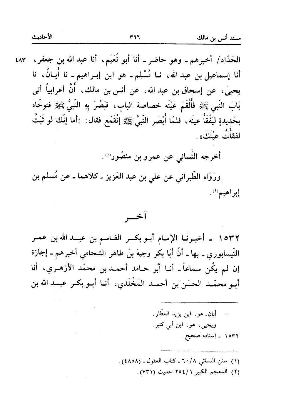 1532 - أَخْبَرَنَا الإِمَامُ أَبُو بَكْرٍ الْقَاسِمُ بْنُ عَبْدِ اللَّهِ بْنِ عُمَرَ النَّيْسَابُورِيُّ بِهَا أَنَّ أَبَا بَكْرٍ وَجِيهَ بْنَ طَاهِرٍ الشَّحَّامِيَّ أخبرهُمْ إِجَازَةً إِنْ لَمْ يَكُنْ سَمَاعًا أَنا أَبُو حَامِدٍ أَحْمَدُ بْنُ مُحَمَّدٍ الأَزْهَرِيُّ أَنا أَبُو مُحَمَّدٍ الْحَسَنُ بْنُ أَحْمَدَ الْمَخْلَدِيُّ أَنا أَبُو بَكْرٍ عَبْدُ اللَّهِ بْنُ مُحَمَّدِ بْنِ مُسْلِمٍ الإِسْفَرَايِنِيُّ نَا مُوسَى بْنُ سَهْلٍ هُوَ أَبُو عِمْرَانَ الرَّمْلِيُّ نَا عَمْرُو بْنُ هَاشِمٍ يَعْنِي الْبَيْرُوتِيَّ حَدَّثَنِي الْهِقْلُ بْنُ زِيَادٍ عَنِ الأَوْزَاعِيِّ عَنْ إِسْحَاقُ بْنُ عَبْدِ اللَّهِ بْنِ أَبِي طَلْحَةَ عَنْ أَنَسِ بْنِ مَالِكٍ قَالَ صَلَّتِ امْرَأَةٌ خلف النَّبِي