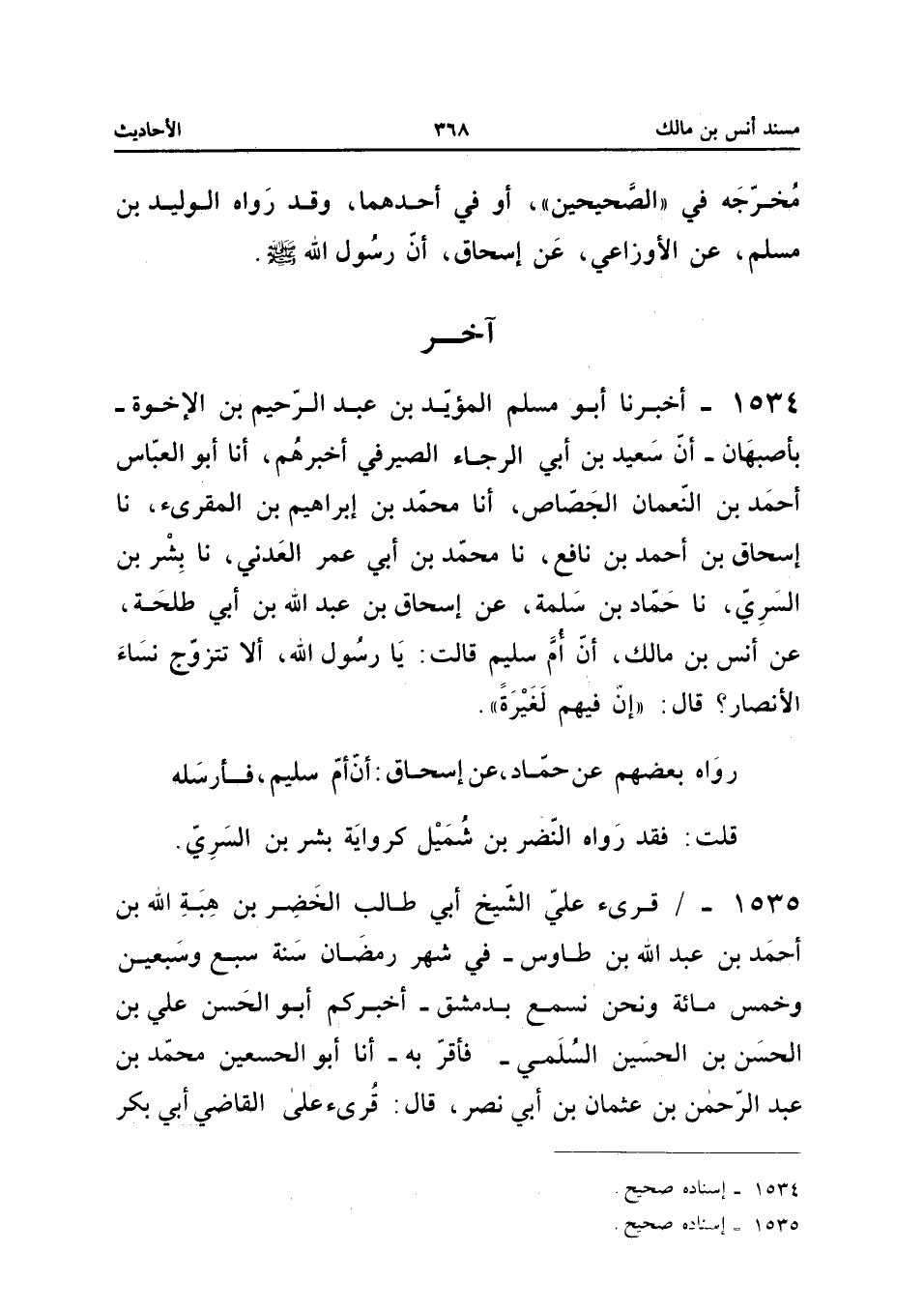 1534 - أَخْبَرَنَا أَبُو مُسْلِمٍ الْمُؤَيَّدُ بْنُ عَبْدِ الرَّحِيمِ بْنِ الإِخْوَةِ بِأَصْبَهَانَ أَنَّ سَعِيدَ بْنَ أَبِي الرَّجَاءِ الصَّيْرَفِيَّ أخبرهُمْ أَنا أَبُو الْعَبَّاسِ أَحْمَدُ بْنُ النُّعْمَانِ الْجَصَّاصُ أَنا مُحَمَّدُ بْنُ إِبْرَاهِيم بن الْمُقْرِئِ نَا إِسْحَاقُ بْنُ أَحْمَدَ بْنِ نَافِعٍ نَا مُحَمَّدُ بْنُ أَبِي عُمَرَ الْعَدَنِيُّ نَا بِشْرُ بْنُ السُّرِّيِّ نَا حَمَّادُ بْنُ سَلَمَةَ عَنْ إِسْحَاقَ بْنِ عَبْدِ اللَّهِ بْنِ أَبِي طَلْحَةَ عَنْ أَنَسِ بْنِ مَالِكٍ أَنَّ أُمَّ سُلَيْمٍ قَالَتْ يَا رَسُولَ اللَّهِ أَلا تَتَزَوَّجَ نِسَاءَ الأَنْصَارِ قَالَ إِنَّ فِيهِمْ لَغَيْرَةً رَوَاهُ بَعْضُهُمْ عَنْ حَمَّادٍ عَنْ إِسْحَاقَ أَنَّ أُمَّ سُلَيْمٍ فَأَرْسَلَهُ قُلْتُ فَقَدْ رَوَاهُ النَّضْرُ بْنُ شُمَيْل كَرِوَايَة بشر بن السّري إِسْنَاده صَحِيح