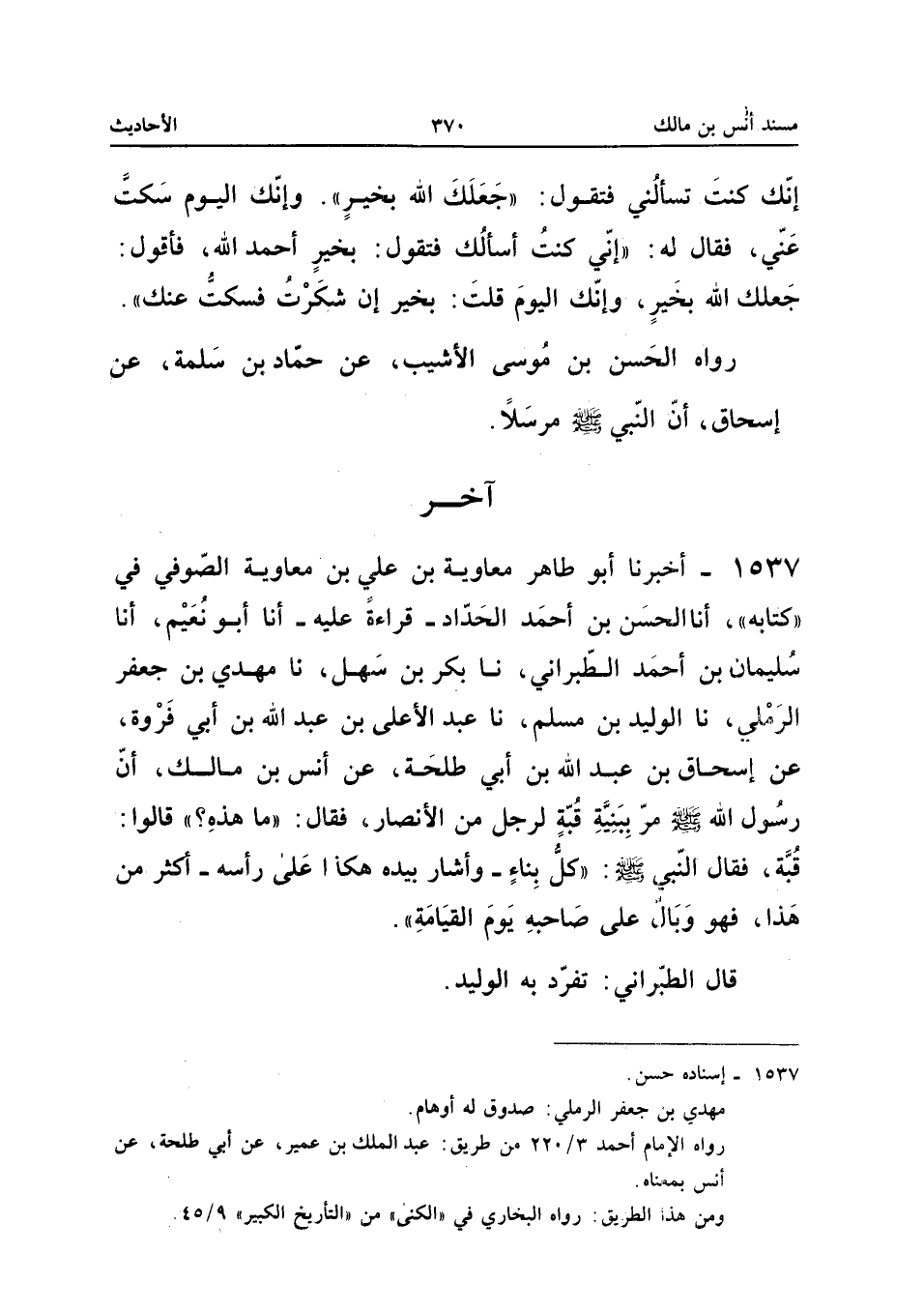 1537 - أَخْبَرَنَا أَبُو طَاهِرٍ مُعَاوِيَةُ بْنُ عَلِيِّ بْنِ مُعَاوِيَةَ الصُّوفِيُّ فِي كِتَابِهِ أَنا الْحَسَنُ بْنُ أَحْمَدَ الْحَدَّادَ قِرَاءَةً عَلَيْهِ أَنا أَبُو نُعَيْمٍ أَنا سُلَيْمَانُ بْنُ أَحْمَدَ الطَّبَرَانِيُّ نَا بَكْرُ بْنُ سَهْلٍ نَا مَهْدِيُّ بْنُ جَعْفَرٍ الرَّمْلِيُّ نَا الْوَلِيدُ بْنُ مُسْلِمٍ نَا عَبْدُ الأَعْلَى بْنُ عَبْدِ اللَّهِ بْنِ أَبِي فَرْوَةَ عَنْ إِسْحَاقُ بْنُ عَبْدِ اللَّهِ بْنِ أَبِي طَلْحَةَ عَنْ أَنَسِ بِنْ مَالِكٍ أَنَّ رَسُولَ اللَّهِ صَلَّى اللَّهُ عَلَيْهِ وَسَلَّمَ مَرَّ بِبَنِيَّةِ قُبَّةٍ لرجل من الْأَنْصَار فَقَالَ مَا هَذِه قالو قُبَّةٌ فَقَالَ النَّبِيُّ صَلَّى اللَّهُ عَلَيْهِ وَسَلَّمَ كل بِنَاء وَأَشَارَ بِيَدِهِ هكذاعلى رَأْسِهِ أَكْثَرُ مِنْ هَذَا فَهُوَ وَبَالٌ عَلَى صَاحِبِهِ يَوْمَ الْقِيَامَةِ قَالَ الطَّبَرَانِيُّ تَفَرَّدَ بِهِ الْوَلِيد