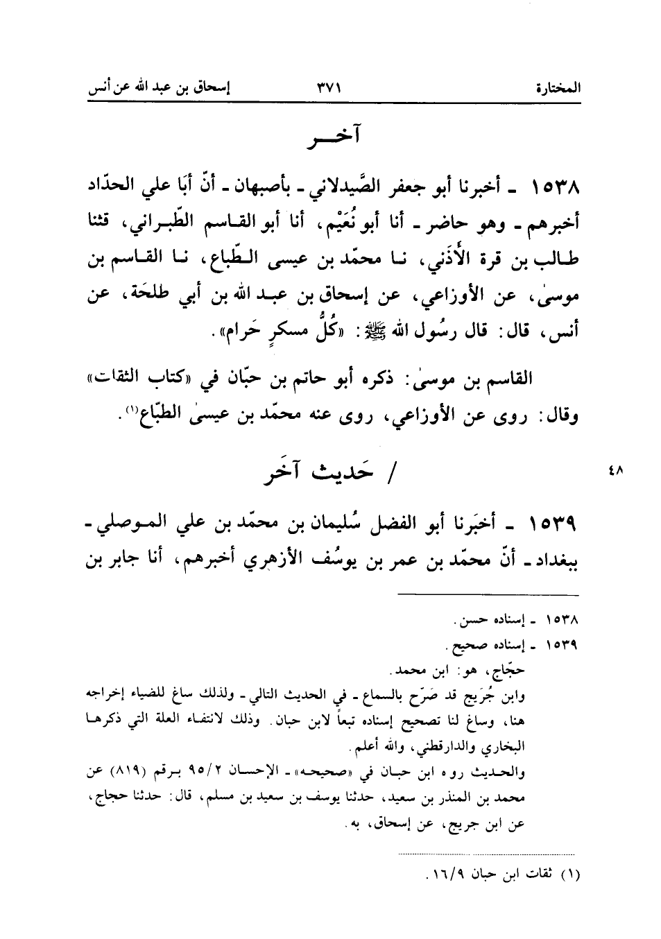 1538 - أَخْبَرَنَا أَبُو جَعْفَرٍ الصَّيْدَلانِيُّ بِأَصْبَهَانَ أَنَّ أَبَا عَلِيٍّ الْحَدَّادَ أَخْبَرَهُمْ وَهُوَ حَاضِرٌ أَنا أَبُو نُعَيْمٍ أَنا أَبُو الْقَاسِمِ الطَّبَرَانِيُّ قثنا طَالِبُ بْنُ قُرَّةَ الأَذَنِيُّ نَا مُحَمَّدُ بْنُ عِيسَى الطَّبَّاعُ نَا الْقَاسِمُ بْنُ مُوسَى عَنِ الأَوْزَاعِيِّ عَنْ إِسْحَاقَ بْنِ عَبْدِ اللَّهِ بْنِ أَبِي طَلْحَةَ عَنْ أَنَسٍ قَالَ قَالَ رَسُولُ اللَّهِ صَلَّى اللَّهُ عَلَيْهِ وَسَلَّمَ كُلُّ مُسْكِرٍ حَرَامٌ الْقَاسِمُ بْنُ مُوسَى ذَكَرَهُ أَبُو حَاتِمِ بْنُ حِبَّانَ فِي كِتَابِ الثِّقَاتِ وَقَالَ رَوَى عَنِ الأَوْزَاعِيِّ رَوَى عَنْهُ مُحَمَّدُ بْنُ عِيسَى الطَّبَّاعُ