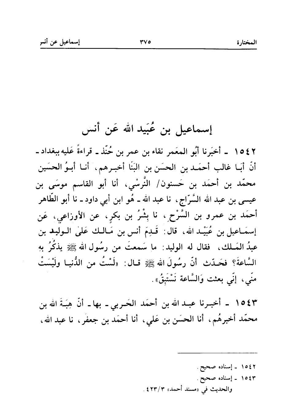 1542 - أَخْبَرَنَا أَبُو الْمَعْمَرِ نَقَاءُ بْنُ عُمَرَ بْنِ حُنَّذٍ قِرَاءَةً عَلَيْهِ بِبَغْدَادَ أَنَّ أَبَا غَالِبٍ أَحْمَدَ بْنَ الْحَسَنِ بْنِ الْبَنَّا أخبرهُمْ أَنا أَبُو الْحُسَيْنِ مُحَمَّدُ بْنُ أَحْمَدَ بْنِ حَسْنُونٍ النَّرْسِيُّ أَنا أَبُو الْقَاسِمِ مُوسَى بْنُ عِيسَى بْنِ عَبْدِ اللَّهِ السَّرَّاجُ نَا عَبْدُ اللَّهِ هُوَ ابْنُ أَبِي دَاوُدَ نَا أَبُو الطَّاهِرِ أَحْمَدُ بْنُ عَمْرِو بْنِ السَّرْحِ نَا بِشْرُ بْنُ بَكْرٍ عَنِ الأَوْزَاعِيِّ عَنْ إِسْمَاعِيلَ بْنِ عُبَيْدِ اللَّهِ قَالَ قَدِمَ أَنَسُ بْنُ مَالِكٍ عَلَى الْوَلِيدِ بْنِ عَبْدِ الْمَلِكِ فَقَالَ لَهُ الْوَلِيدُ مَا سَمِعْتُ مِنْ رَسُولِ اللَّهِ صَلَّى اللَّهُ عَلَيْهِ وَسَلَّمَ يَذْكُرُ بِهِ السَّاعَةَ فَحَدَّثَ إِنَّ رَسُولَ اللَّهِ صَلَّى اللَّهُ عَلَيْهِ وَسَلَّمَ قَالَ لَسْتُ مِنَ الدُّنْيَا وَلَيْسَتْ مِنِّي إِنِّي بعثت والساعة نَسْتَبِق إِسْنَاده صَحِيح