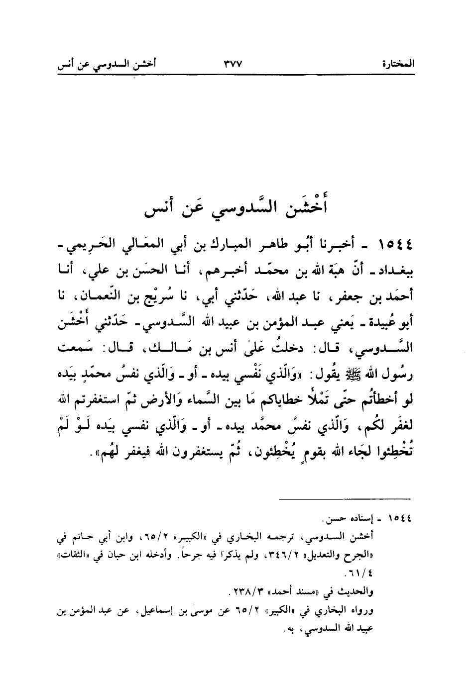 1544 - أَخْبَرَنَا أَبُو طَاهِرٍ الْمُبَارَكُ بْنُ أَبِي الْمَعَالِي الْحَرِيمِيُّ بِبَغْدَادَ أَنَّ هِبَةَ اللَّهِ بْنَ مُحَمَّدٍ أَخْبَرَهُمْ أَنا الْحَسَنُ بْنُ عَلِيٍّ أَنا أَحْمَدُ بْنُ جَعْفَرٍ نَا عَبْدُ اللَّهِ حَدَّثَنِي أَبِي نَا سُرَيْجُ بْنُ النُّعْمَانِ نَا أَبُو عُبَيْدَةَ يَعْنِي عَبْدَ الْمُؤْمِنِ بْنَ عُبَيْدِ اللَّهِ السَّدُوسِيَّ حَدَّثَنِي أَخْشَنُ السَّدُوسِيُّ قَالَ دَخَلْتُ عَلَى أَنَسِ بْنَ مَالِكٍ قَالَ سَمِعْتُ رَسُولَ اللَّهِ صَلَّى اللَّهُ عَلَيْهِ وَسَلَّمَ يَقُولُ وَالَّذِي نَفْسِي بِيَدِهِ أَوْ وَالَّذِي نَفْسُ مُحَمَّدٍ بِيَدِهِ لَوْ أَخْطَأْتُمْ حَتَّى تَمْلأَ خَطَايَاكُمْ مَا بَيْنَ السَّمَاءِ وَالأَرْضِ ثُمَّ اسْتَغْفَرْتُمُ اللَّهَ لَغَفَرَ لَكُمْ وَالَّذِي نَفْسُ مُحَمَّدٍ بِيَدِهِ أَوْ وَالَّذِي نَفْسِي بِيَدِهِ لَوْ لَمْ تُخْطِئُوا لَجَاءَ اللَّهُ بِقَوْمٍ يُخْطِئُونَ ثُمَّ يَسْتَغْفِرُونَ الله فَيغْفر لَهُم