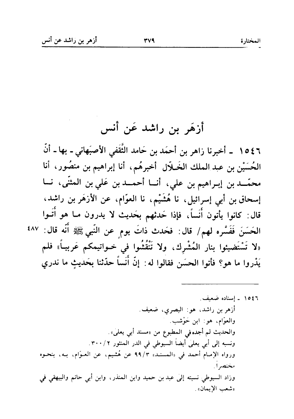 1546 - أَخْبَرَنَا زَاهِرُ بْنُ أَحْمَدَ بْنِ حَامِدٍ الثَّقَفِيُّ الأَصْبَهَانِيُّ بِهَا أَنَّ الْحُسَيْنَ بْنَ عَبْدِ الْمَلِكِ الْخَلالَ أَخْبَرَهُمْ أَنا إِبْرَاهِيمُ بْنُ مَنْصُورٍ أَنا مُحَمَّدُ بْنُ إِبْرَاهِيمَ بْنِ عَلِيٍّ أَنا أَحْمَدُ بْنُ عَلِيِّ بْنِ الْمُثَنَّى نَا إِسْحَاقُ بْنُ [أَبِي إِسْرَائِيلَ نَا هُشَيْمٌ نَا الْعَوَّامُ عَنِ الْأَزْهَر بن رشاد قَالَ كَانُوا يَأْتُونَ أَنَسًا فَإِذَا حَدَّثَهُمْ بِحَدِيثٍ لَا يَدْرُونَ مَا هُوَ أَتَوْا الْحَسَنَ فَفَسَّرَهُ لَهُمْ قَالَ فَحَدَّثَ ذَاتَ يَوْمٍ عَنِ النَّبِيِّ صَلَّى اللَّه عَلَيْهِ وَسَلَّمَ أَنَّهُ قَالَ لَا تَسْتَضِيئُوا بِنَارِ الْمُشْرِكِ وَلا تَنْقُشُوا فِي خَوَاتِيمِكُمْ عَرَبيا فَلم يدروا ماهو فَأَتَوُا الْحَسَنَ فَقَالُوا لَهُ إِنَّ أَنَسًا حَدثنَا بِحَدِيثٍ مَا نَدْرِي