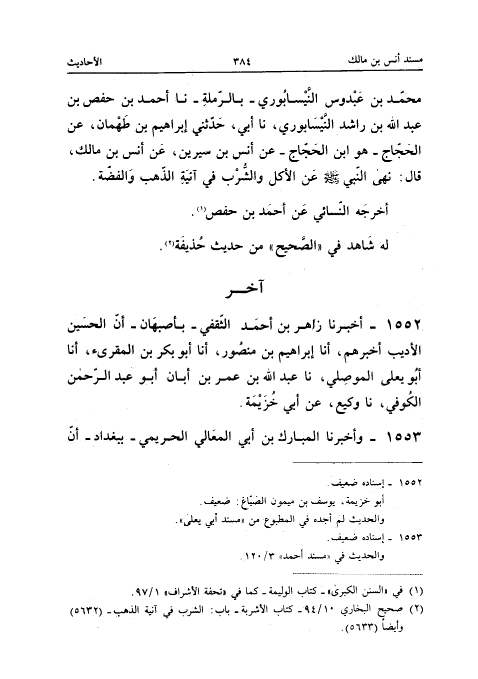 1553 - وَأَخْبَرَنَا الْمُبَارَكُ بْنُ أَبِي الْمَعَالِي الْحَرِيمِيُّ بِبَغْدَادَ أَنَّ هِبَةَ اللَّهِ بْنَ مُحَمَّدٍ أَخْبَرَهُمْ أَنَا الْحسن بن عَليّ أَنا أَحْمد بن جفعر نَا عَبْدُ اللَّهِ نَا أَبِي نَا وَكِيعٌ نَا أَبُو خُزَيْمَةَ عَنْ أَنَسِ بْنِ سِيرِينَ عَنْ أَنَسِ بْنِ مَالِكٍ أَنَّ النَّبِيَّ