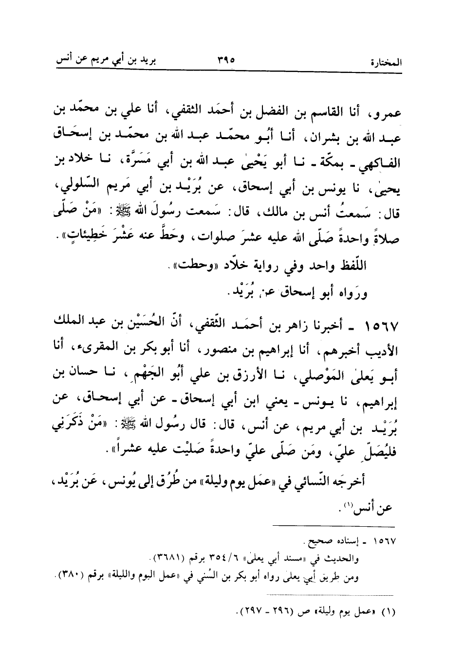 1567 - أَخْبَرَنَا زَاهِرُ بْنُ أَحْمَدَ الثَّقَفِيُّ أَنَّ الْحُسَيْنَ بْنَ عَبْدِ الْمَلِكِ الأَدِيبَ أَخْبَرَهُمْ أَنا إِبْرَاهِيمُ بن مَنْصُور أَنا أَبُو بكر بن الْمُقْرِئ أَنا أَبُو يعلى الْموصِلِي نَا الأرزق بْنُ عَلِيٍّ أَبُو الْجَهْمِ نَا حَسَّانُ بْنُ إِبْرَاهِيمَ نَا يُونُسُ يَعْنِي ابْنَ أَبِي إِسْحَاقَ عَنْ أَبِي إِسْحَاقَ عَنْ بُرَيْدِ بْنِ أَبِي مَرْيَمَ عَنْ أَنَسٍ قَالَ قَالَ رَسُولُ اللَّهِ صَلَّى اللَّهُ عَلَيْهِ وَسَلَّمَ مَنْ ذَكَرَنِي فَلْيُصَلِّ عَلَيَّ وَمَنْ صَلَّى عَلَيَّ وَاحِدَةً صَلَّيْتُ عَلَيْهِ عَشْرًا أَخْرَجَهُ النَّسَائِيُّ فِي عَمَلِ يَوْمٍ وَلَيْلَةٍ مِنْ طُرُقٍ إِلَى يُونُسَ عَنْ بُرَيْدٍ عَنْ أنس