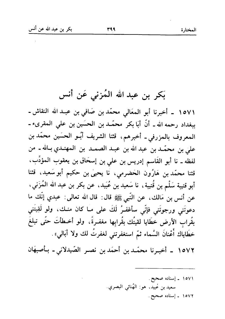 1571 - أَخْبَرَنَا أَبُو الْمَعَالِي مُحَمَّدُ بْنُ صَافِي بْنِ عَبْدِ اللَّهِ النَّقَّاشُ بِبَغْدَادَ رَحِمَهُ اللَّهُ أَنَّ أَبَا بَكْرٍ مُحَمَّدَ بْنَ الْحُسَيْنِ بْنِ عَلِيٍّ الْمُقْرِئَ الْمَعْرُوفَ بِالْمَزْرَفِيِّ أخبرهُمْ قثنا الشَّرِيفُ أَبُو الْحُسَيْنِ مُحَمَّدُ بْنُ عَلِيِّ بْنِ مُحَمَّدِ بْنِ عَبْدِ اللَّهِ بْنِ عَبْدِ الصَّمَدِ بْنِ الْمُهْتَدِي بِاللَّهِ مِنْ لَفْظِهِ نَا أَبُو الْقَاسِمِ إِدْرِيسُ بْنُ عَلِيِّ بْنِ إِسْحَاقَ بْنِ يَعْقُوبَ الْمُؤَدِّبُ قثنا مُحَمَّدُ بْنُ هَارُونَ الْحَضْرَمِيُّ نَا يَحْيَى بْنُ حَكِيمٍ أَبُو سَعِيدٍ قثنا أَبُو قُتَيْبَةَ سَلْمُ بْنُ قُتَيْبَةَ نَا سَعِيدُ بْنُ عُبَيْدٍ عَنْ بَكْرِ بْنِ عَبْدِ اللَّهِ الْمُزْنِيِّ عَنْ أَنَسِ بْنِ مَالِكٍ عَنِ النَّبِيِّ صَلَّى اللَّهُ عَلَيْهِ وَسَلَّمَ قَالَ قَالَ اللَّهُ تَعَالَى عَبْدِي إِنَّكَ مَا دَعَوْتَنِي وَرَجَوْتَنِي فَإِنِّي سَأَغْفِرُ لَكَ عَلَى مَا كَانَ مِنْكَ وَلَوْ لَقِيتَنِي بِقُرَابِ الأَرْضِ خَطَايَا لَقِيتُكَ بِقُرَابِهَا مَغْفِرَةً وَلَوْ أَخْطَأْتَ حَتَّى تَبْلُغَ خَطَايَاكَ أَعْنَانَ السَّمَاءِ ثُمَّ اسْتَغْفَرْتَنِي لغفرت لَك وَلَا أُبَالِي إِسْنَاده صَحِيح