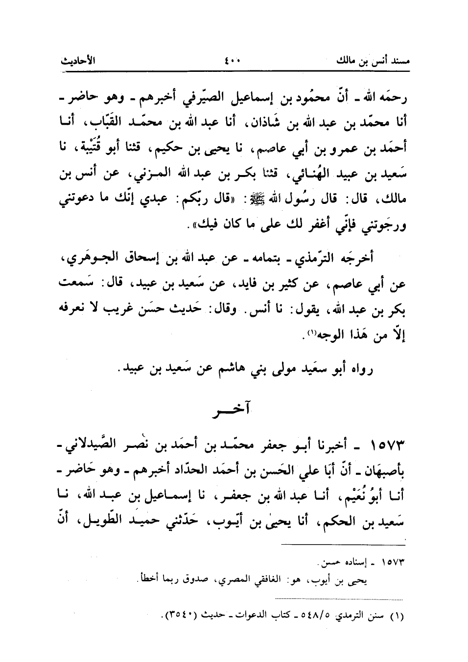 صَلَّى اللَّهُ عَلَيْهِ وَسَلَّمَ قَالَ رَبُّكُمْ عَبْدِي إِنَّكَ مَا دَعَوْتَنِي وَرَجَوْتَنِي فَإِنِّي أَغْفِرُ لَكَ مَا كَانَ فِيكَ أَخْرَجَهُ التِّرْمِذِيُّ بِتَمَامِهِ عَنْ عَبْدِ اللَّهِ بْنِ إِسْحَاقَ الْجَوْهَرِيِّ عَنْ أَبِي عَاصِمٍ عَنْ كَثِيرِ بْنِ فَايِدٍ عَنْ سَعِيدِ بْنِ عُبَيْدٍ قَالَ سَمِعْتُ بَكْرَ بْنَ عَبْدِ اللَّهِ يَقُولُ نَا أَنَسٌ وَقَالَ حَدِيثٌ حَسَنٌ غَرِيبٌ لَا نَعْرِفُهُ إِلَّا مِنْ هَذَا الْوَجْهِ رَوَاهُ أَبُو سَعِيدٍ مَوْلَى بَنِي هَاشِمٍ عَن سعيد بن عبيد