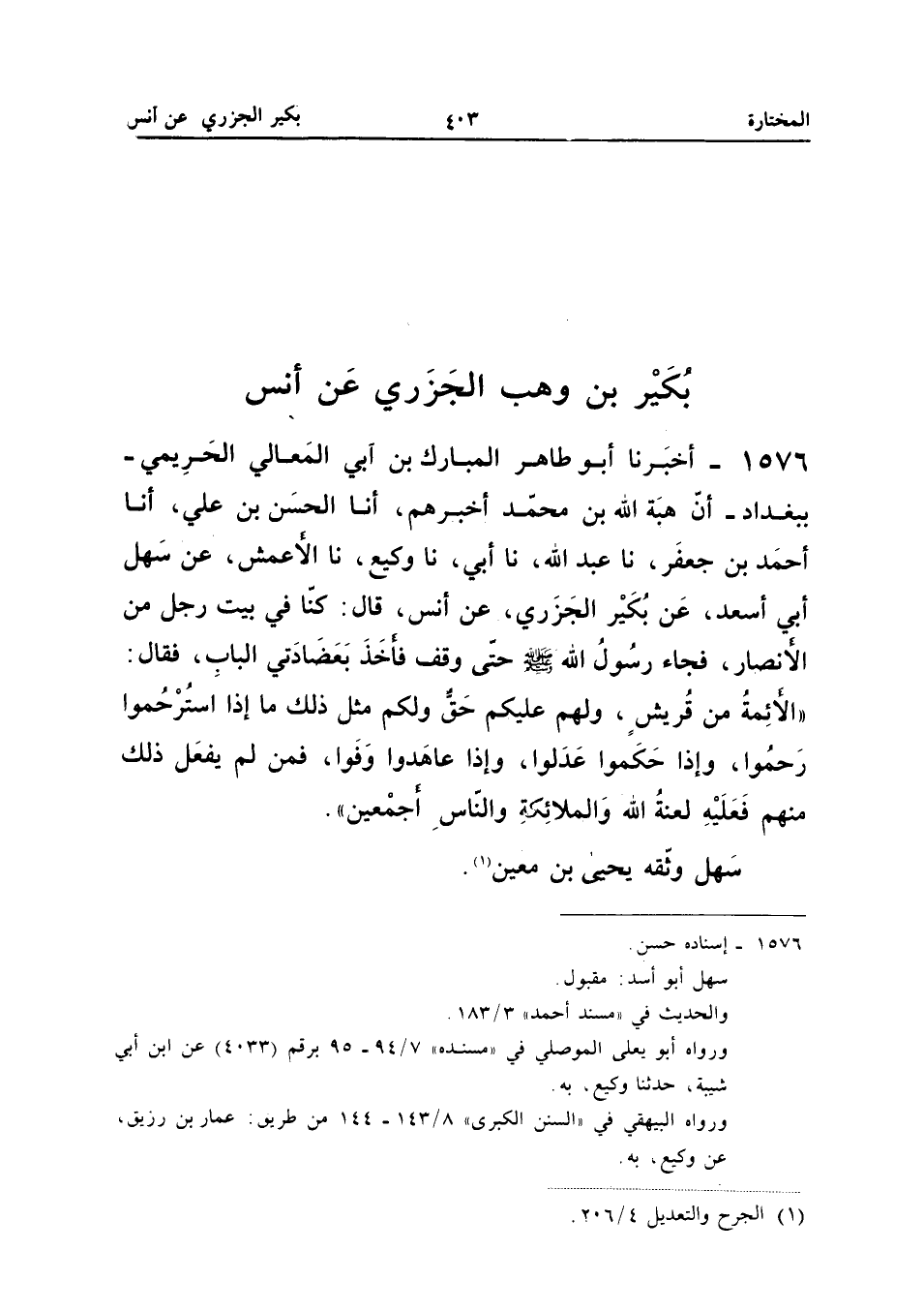 1576 - أَخْبَرَنَا أَبُو طَاهِرٍ الْمُبَارَكُ بْنُ أَبِي الْمَعَالِي الْحَرِيمِيُّ بِبَغْدَادَ أَنَّ هِبَةَ اللَّهِ بْنَ مُحَمَّدٍ أَخْبَرَهُمْ أَنا الْحَسَنُ بْنُ عَلِيٍّ أَنا أَحْمَدُ بْنُ جَعْفَرٍ نَا عَبْدُ اللَّهِ نَا أَبِي نَا وَكِيعٌ نَا الأَعْمَشُ عَنْ سَهْلٍ أَبِي أَسْعَدَ عَنْ بُكَيْرٍ الْجَزَرِيِّ عَنْ أَنَسٍ قَالَ كُنَّا فِي بَيْتِ رَجُلٍ مِنَ الأَنْصَارِ فَجَاءَ رَسُولُ اللَّهِ صَلَّى اللَّهُ عَلَيْهِ وَسَلَّمَ حَتَّى وَقَفَ فَأَخَذَ بِعِضَادَتَيِ الْبَابِ فَقَالَ الأَئِمَّةُ مِنْ قُرَيْشٍ وَلَهُمْ عَلَيْكُمْ حَقٌّ وَلَكُمْ مِثْلُ ذَلِكَ مَا إِذَا اسْتُرْحِمُوا رَحِمُوا وَإِذَا حَكَمُوا عَدَلُوا وَإِذَا عَاهَدُوا وَفَوْا فَمَنْ لَمْ يَفْعَلْ ذَلِكَ مِنْهُمْ فَعَلَيْهِ لَعْنَةُ اللَّهِ وَالْمَلائِكَةِ وَالنَّاسِ أَجْمَعِينَ سَهْلٌ وَثَّقَهُ يَحْيَى بْنُ مَعِينٍ