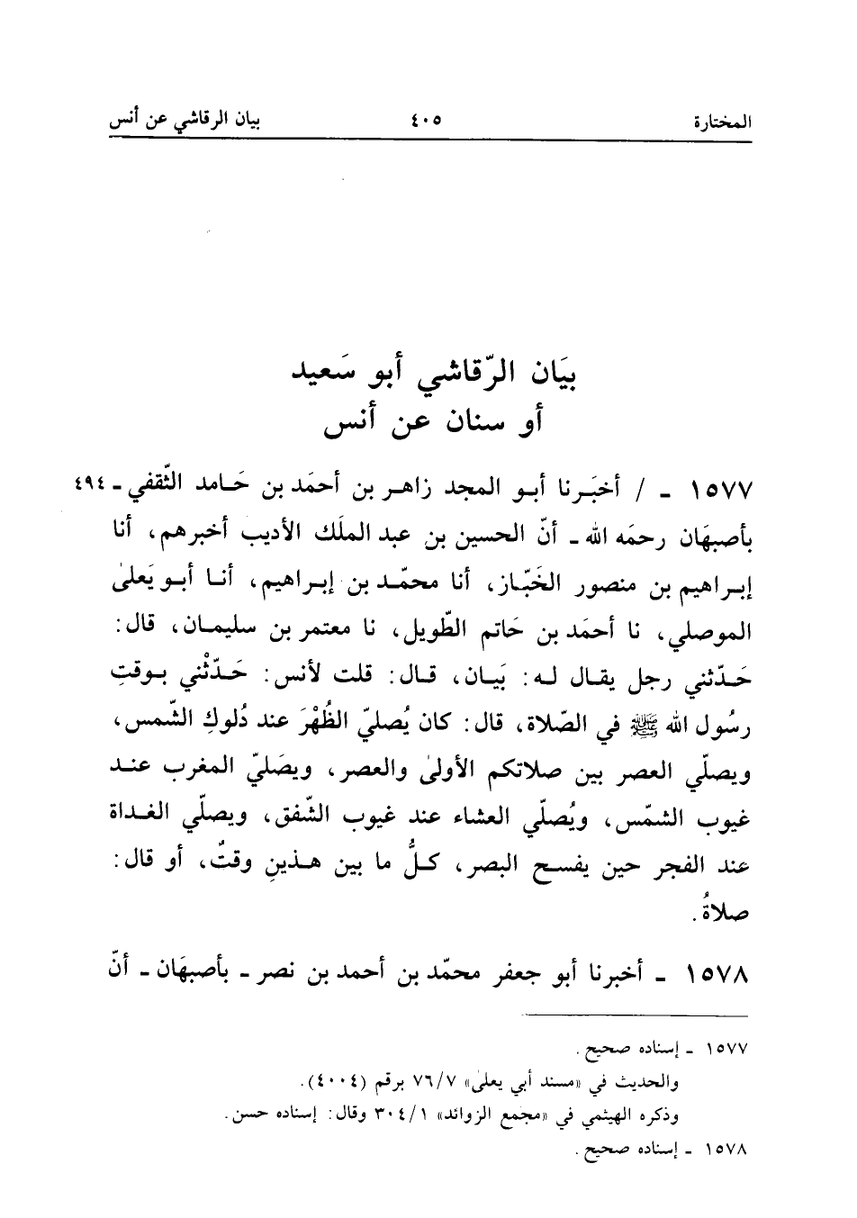 1577 - أَخْبَرَنَا أَبُو الْمَجْدِ زَاهِرُ بْنُ أَحْمَدَ بْنِ حَامِدٍ الثَّقَفِيُّ بِأَصْبَهَانَ رَحِمَهُ اللَّهُ أَنَّ الْحُسَيْنَ بْنَ عَبْدِ الْمَلِكِ الأَدِيبَ أَخْبَرَهُمْ أَنا إِبْرَاهِيمُ بْنُ مَنْصُورٍ الْخَبَّازُ أَنا مُحَمَّدُ بْنُ إِبْرَاهِيمَ أَنا أَبُو يَعْلَى الْمَوْصِلِيُّ نَا أَحْمَدُ بْنُ حَاتِمٍ الطَّوِيلُ نَا مُعْتَمِرُ بْنُ سُلَيْمَانَ قَالَ حَدَّثَنِي رَجُلٌ يُقَالُ لَهُ بَيَانٌ قَالَ قُلْتُ لأَنَسٍ حَدَّثَنِي بِوَقْتِ رَسُولِ اللَّهِ صَلَّى اللَّهُ عَلَيْهِ وَسَلَّمَ فِي الصَّلاةِ قَالَ كَانَ يُصَلِّي الظُّهْرَ عِنْدَ دُلُوكِ الشَّمْسِ وَيُصَلِّي الْعَصْرَ بَيْنَ صَلاتِكُمُ الأُولَى وَالْعَصْرِ وَيُصَلِّي الْمَغْرِبَ عِنْدَ غُيُوبِ الشَّمْسِ وَيُصَلِّي الْعِشَاءَ عِنْدَ غُيُوبِ الشَّفَقِ وَيُصَلِّي الْغَدَاةَ عِنْدَ الْفَجْرِ حِينَ يُفْسِحُ الْبَصَرُ كُلُّ مَا بَيْنَ هَذَيْنِ وَقْتٌ أَوْ قَالَ صَلاةٌ إِسْنَاده صَحِيح
