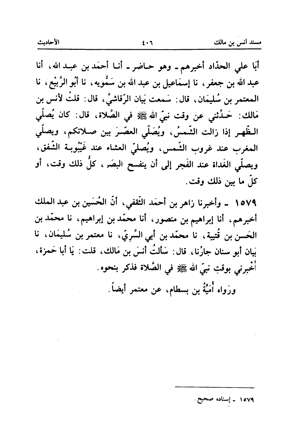 1579 - وَأَخْبَرَنَا زَاهِرُ بْنُ أَحْمَدَ الثَّقَفِيُّ أَنَّ الْحُسَيْنَ بْنَ عَبْدِ الْمَلِكِ أَخْبَرَهُمْ أَنا إِبْرَاهِيمُ بْنُ مَنْصُورٍ أَنا مُحَمَّدُ بْنُ إِبْرَاهِيمَ نَا مُحَمَّدُ بْنُ الْحَسَنِ بْنِ قُتَيْبَةَ نَا مُحَمَّدُ بْنُ أَبِي السُّرِّيِّ نَا مُعْتَمِرُ بْنُ سُلَيْمَانَ نَا بَيَانٌ أَبُو سِنَان جَارُنَا قَالَ سَأَلْتُ أَنَسَ بْنَ مَالِكٍ قُلْتُ يَا أَبَا حَمْزَةَ أخبرنِي بِوَقْتِ نَبِيِّ اللَّهِ صَلَّى اللَّهُ عَلَيْهِ وَسَلَّمَ فِي الصَّلاةِ فَذَكَرَ بِنَحْوِهِ وَرَوَاهُ أُمَيَّةُ بْنُ بِسْطَامٍ عَنْ مُعْتَمِرٍ أَيْضًا