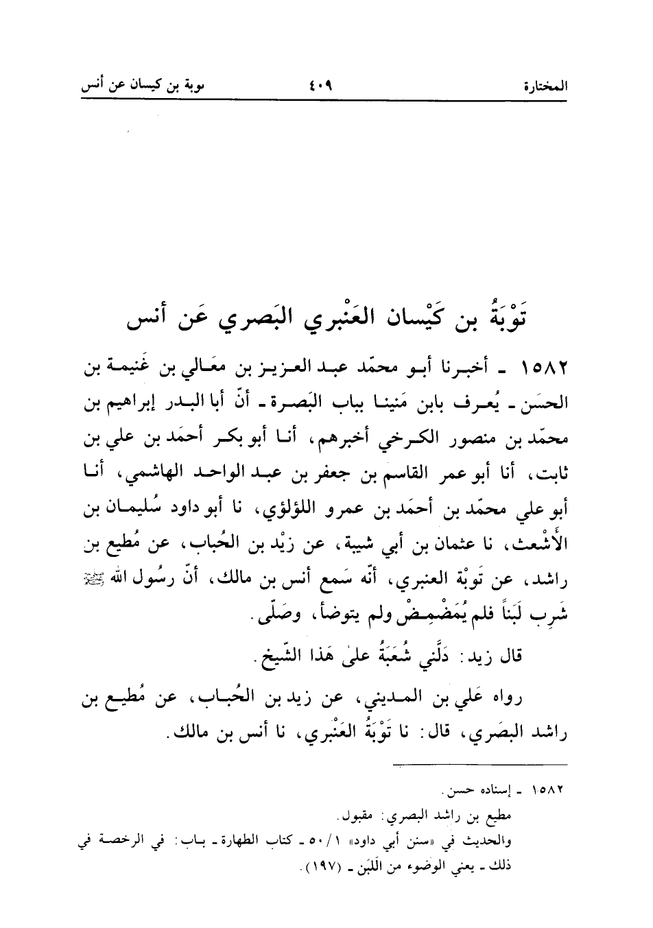 1582 - أَخْبَرَنَا أَبُو مُحَمَّدٍ عَبْدُ الْعَزِيزِ بْنُ مَعَالِي بْنِ غَنِيمَةَ بْنِ الْحَسَنِ يُعْرَفُ بِابْنِ مَنِينَا بِبَابِ الْبَصْرَةِ أَنَّ أَبَا الْبَدْرِ إِبْرَاهِيمَ بْنَ مُحَمَّدِ بْنِ مَنْصُورٍ الْكَرْخِيَّ أخبرهُمْ أَنا أَبُو بَكْرٍ أَحْمَدُ بْنُ عَلِيِّ بْنِ ثَابِتٍ أَنا أَبُو عُمَرَ الْقَاسِمُ بْنُ جَعْفَرِ بْنِ عَبْدِ الْوَاحِدِ الْهَاشِمِيُّ أَنا أَبُو عَلِيٍّ مُحَمَّدُ بْنُ أَحْمد بن عَمْرو اللؤْلُؤِي نَا أَبُو دَاوُدَ سُلَيْمَانُ بْنُ الأَشْعَثِ نَا عُثْمَانُ بْنُ أَبِي شَيْبَةَ عَنْ زَيْدِ بْنِ الْحُبَابِ عَنْ مُطِيعِ بْنِ رَاشِدٍ عَنْ تَوْبَةَ الْعَنْبَرِيِّ أَنَّهُ سَمِعَ أَنَسَ بْنَ مَالِكٍ أَنَّ رَسُولَ اللَّهِ صَلَّى اللَّهُ عَلَيْهِ وَسَلَّمَ شَرِبَ لَبَنًا فَلَمْ يُمَضْمِضْ وَلَمْ يَتَوَضَّأْ وَصَلَّى قَالَ زَيْدٌ دَلَّنِي شُعْبَةُ عَلَى هَذَا الشَّيْخِ رَوَاهُ عَليّ بن الْمَدِينِيِّ عَنْ زَيْدِ بْنِ الْحُبَابِ عَنْ مُطِيعِ بْنِ رَاشِدٍ الْبَصْرِيِّ قَالَ نَا تَوْبَةُ الْعَنْبَرِيُّ نَا أَنَسُ بْنُ مَالِكٍ