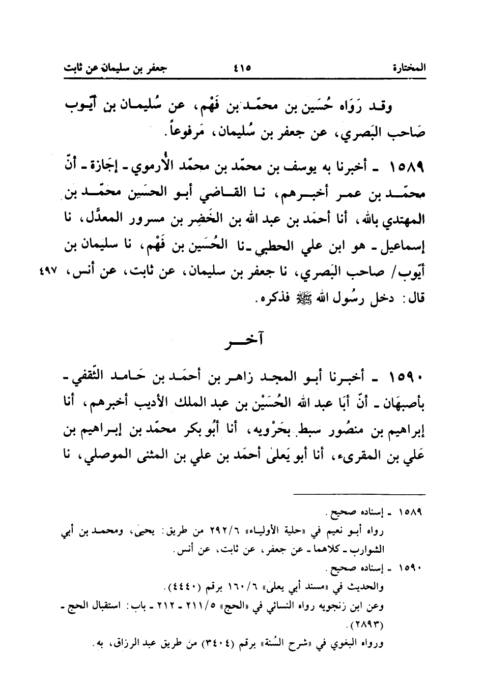 1590 - أَخْبَرَنَا أَبُو الْمَجْدِ زَاهِرُ بْنُ أَحْمَدَ بْنِ حَامِدٍ الثَّقَفِيُّ بِأَصْبَهَانَ أَنَّ أَبَا عَبْدِ اللَّهِ الْحُسَيْنَ بْنَ عَبْدِ الْمَلِكِ الأَدِيبَ أَخْبَرَهُمْ أَنا إِبْرَاهِيمُ بْنُ مَنْصُورٍ سِبْطُ بَحْرُوَيْهِ أَنَا أَبُو بَكْرٍ مُحَمَّدُ بْنُ إِبْرَاهِيمَ بْنِ عَلِيِّ بْنِ الْمُقْرِئِ أَنا أَبُو يَعْلَى أَحْمَدُ بْنُ عَلِيِّ بْنِ الْمُثَنَّى الْمَوْصِلِيُّ نَا أَبُو بَكْرِ بْنُ زَنْجُوَيْهِ هُوَ مُحَمَّدُ بْنُ عَبْدِ الْمَلِكِ نَا عَبْدُ الرَّزَّاقِ أَنا جَعْفَرُ بْنُ سُلَيْمَانَ عَنْ ثَابِتٍ عَنْ أَنَسٍ قَالَ دَخَلَ النَّبِيُّ