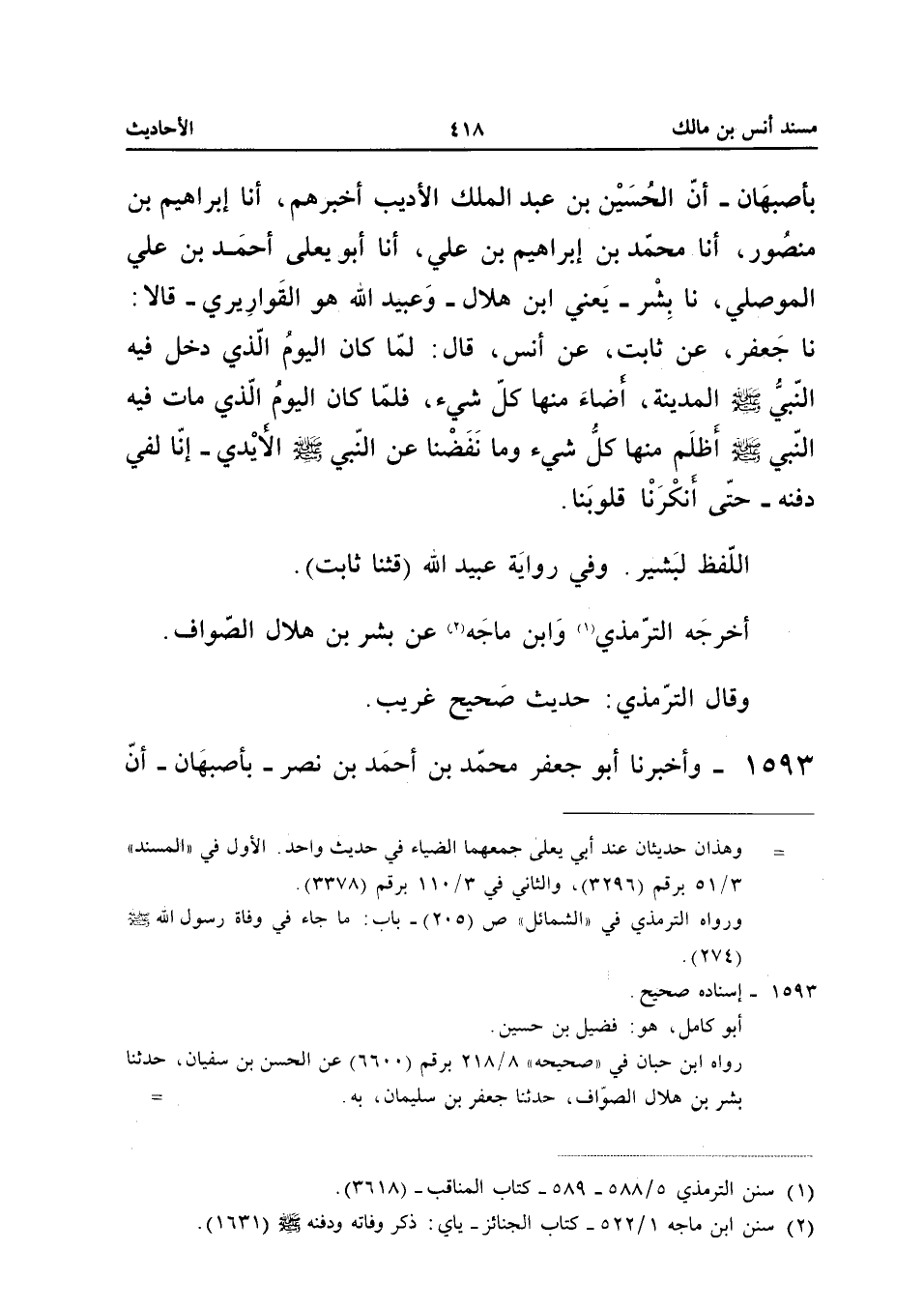 صَلَّى اللَّهُ عَلَيْهِ وَسَلَّمَ الْمَدِينَةَ أَضَاءَ مِنْهَا كل شَيْء فَلَمَّا كَانَا الْيَوْمُ الَّذِي مَاتَ فِيهِ النَّبِيُّ صَلَّى اللَّهُ عَلَيْهِ وَسَلَّمَ أَظْلَمَ مِنْهَا كُلُّ شَيْءٍ وَمَا نَفَضْنَا عَنِ النَّبِيِّ صَلَّى اللَّهُ عَلَيْهِ وَسَلَّمَ الأَيْدِي إِنَّا لَفِي دَفْنِهِ حَتَّى أَنْكَرْنَا قُلُوبَنَا اللَّفْظُ لِبَشِيرٍ وَفِي رِوَايَةِ عُبَيْدِ اللَّهِ (قثنا ثَابِتٌ) أَخْرَجَهُ التِّرْمِذِيُّ وَابْنُ مَاجَهْ عَنْ بِشْرِ بْنِ هِلالٍ الصَّوَّافِ وَقَالَ التِّرْمِذِيُّ حَدِيثٌ صَحِيحٌ غَرِيب إِسْنَاده صَحِيحٌ