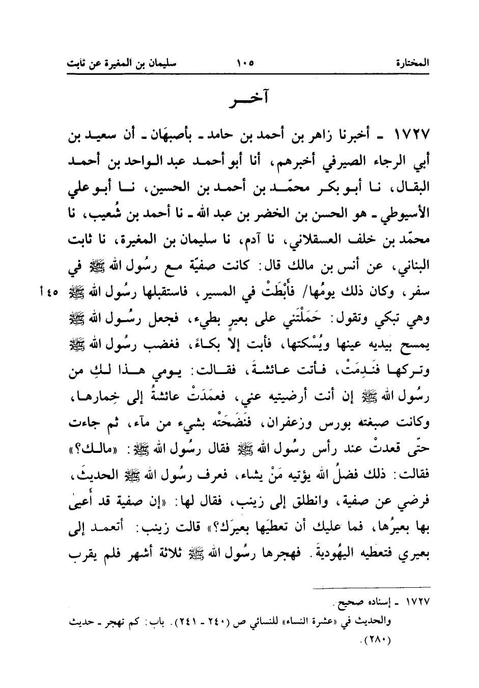 1727 - أَخْبَرَنَا زَاهِرُ بْنُ أَحْمَدَ بْنِ حَامِدٍ بِأَصْبَهَانَ أَنَّ سَعِيدَ بْنَ أَبِي الرَّجَاءِ الصَّيْرَفِيَّ أَخْبَرَهُمْ أَنَا أَبُو أَحْمَدَ عَبْدُ الْوَاحِدِ بْنُ أَحْمَدَ الْبَقَّالُ نَا أَبُو بَكْرٍ مُحَمَّدُ بْنُ أَحْمَدَ بْنِ الْحُسَيْنِ نَا أَبُو عَلِيٍّ الأَسْيُوطِيُّ هُوَ الْحَسَنُ بْنُ الْخَضِرِ بْنِ عَبْدِ اللَّهِ نَا أَحْمَدُ بْنُ شُعَيْبٍ نَا مُحَمَّدُ بْنُ خَلَفٍ الْعَسْقَلانِيُّ نَا آدَمُ نَا سُلَيْمَانُ بْنُ الْمُغِيرَةِ نَا ثَابِتٌ الْبُنَانِيُّ عَنْ أَنَسِ بْنِ مَالِكٍ قَالَ كَانَتْ صَفِيَّةُ مَعَ رَسُولِ اللَّهِ صَلَّى اللَّهُ عَلَيْهِ وَسَلَّمَ فِي سَفَرٍ وَكَانَ ذَلِكَ يَوْمهَا فأبطت فِي الْمَسِيرِ فَاسْتَقْبَلَهَا رَسُولُ اللَّهِ صَلَّى اللَّهُ عَلَيْهِ وَسَلَّمَ فِي سَفَرٍ وَكَانَ ذَلِكَ يَوْمَهَا فأبطت فِي الْمَسِيرِ فَاسْتَقْبَلَهَا رَسُولُ اللَّهِ صَلَّى اللَّهُ عَلَيْهِ وَسَلَّمَ وَهِيَ تَبْكِي وَتَقُولُ حَمَلْتَنِي عَلَى بَعِيرٍ بَطِيءٍ فَجَعَلَ رَسُولُ اللَّهِ صَلَّى اللَّهُ عَلَيْهِ وَسَلَّمَ يَمْسَحُ بِيَدَيْهِ عَيْنَهَا وَيُسْكِتُهَا فَأَبَتْ إِلا بُكَاءً فَغَضِبَ رَسُولُ اللَّهِ صَلَّى اللَّهُ عَلَيْهِ وَسَلَّمَ وَتَرَكَهَا فَنَدِمَتْ فَأَتَتْ عَائِشَةَ فَقَالَتْ يَوْمِي هَذَا لَكِ مِنْ رَسُولِ اللَّهِ صَلَّى الله عَلَيْهِ وَسلم إِن أَنْت أرضيتيه عَنِّي فَعَمِدَتْ عَائِشَةُ إِلَى خِمَارِهَا وَكَانَتْ صَبَغَتْهُ بِوَرَسٍ وَزَعْفَرَانٍ فَنَضَحَتْهُ بِشَيْءٍ مِنْ مَاءٍ ثُمَّ جَاءَتْ حَتَّى قَعَدَتْ عِنْدَ رَأْسِ رَسُولِ اللَّهِ صَلَّى اللَّهُ عَلَيْهِ وَسَلَّمَ فَقَالَ رَسُولُ اللَّهِ مَالك فَقَالَتْ ذَلِكَ فَضْلُ اللَّهِ يُؤْتِيهِ مَنْ يَشَاءُ فَعَرَفَ رَسُولُ اللَّهِ صَلَّى اللَّهُ عَلَيْهِ وَسَلَّمَ الْحَدِيثَ فَرَضِيَ عَنْ صَفِيَّةَ وَانْطَلَقَ إِلَى زَيْنَبَ فَقَالَ لَهَا إِن صَفِيَّة قد أعيى بِهَا بَعِيرُهَا فَمَا عَلَيْكِ أَنْ تُعْطِيهَا بَعِيرَكِ قَالَتْ زَيْنَبُ أَتَعْمَدُ إِلَى بَعِيرِي فَتُعْطِيهِ الْيَهُودِيَّةَ فَهَجَرَهَا رَسُولُ اللَّهِ صَلَّى اللَّهُ عَلَيْهِ وَسَلَّمَ ثَلاثَةَ أَشْهُرٍ فَلَمْ يَقْرَبْ