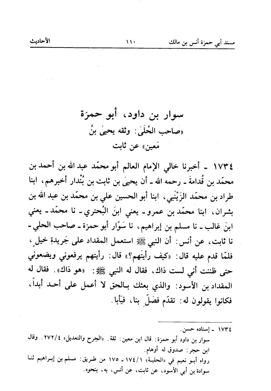 1734 - أَخْبَرَنَا خَالِي الإِمَامُ الْعَالِمُ أَبُو مُحَمَّدٍ عَبْدُ اللَّهِ بْنُ أَحْمَدَ بْنِ مُحَمَّدِ بْنِ قُدَامَةَ رَحِمَهُ اللَّهُ أَنَّ يَحْيَى بْنَ ثَابِتِ بْنِ بنْدَار أَخْبَرَهُمْ أبنا طَرَّادُ بْنُ مُحَمَّدٍ الزَّيْنَبِيُّ أبنا أَبُو الْحُسَيْنِ عَلِيُّ بْنُ مُحَمَّدِ بْنِ عَبْدِ الله بن بَشرَان ابْنا مُحَمَّدُ بْنُ عَمْرٍو يَعْنِي ابْنَ الْبُحْتُرِيِّ نَا مُحَمَّدٌ يَعْنِي ابْنَ غَالِبٍ نَا مُسْلِمُ بْنُ إِبْرَاهِيمَ نَا سَوَّارٌ أَبُو حَمْزَةَ صَاحِبُ الْحُلِيِّ نَا ثَابِتٌ عَنْ أَنَسٍ أَنَّ النَّبِيَّ صَلَّى اللَّهُ عَلَيْهِ وَسَلَّمَ اسْتَعْمَلَ الْمِقْدَادَ عَلَى جَرِيدَةِ خَيْلٍ فَلَمَّا قَدِمَ عَلَيْهِ قَالَ كَيْف رَأَيْتَهُمْ قَالَ رَأَيْتُهُمْ يَرْفَعُونِي وَيَضَعُونِي حَتَّى ظَنَنْتَ أَنِّي لَسْتُ ذَاكَ فَقَالَ لَهُ النَّبِيُّ صَلَّى اللَّهُ عَلَيْهِ وَسَلَّمَ هُوَ ذَاكَ فَقَالَ لَهُ الْمِقْدَادُ بْنُ الأَسْوَدِ وَالَّذِي بَعَثَكَ بِالْحَقِّ لَا أَعْمَلُ عَلَى أَحَدٍ أَبَدًا فَكَانُوا يَقُولُونَ لَهُ تَقَدَّمْ فصل بِنَا فيأبا