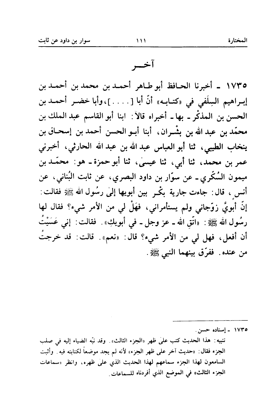 1735 - أَخْبَرَنَا الْحَافِظُ أَبُو طَاهِرٍ أَحْمَدُ بْنُ مُحَمَّدٍ بْنِ أَحْمَدَ بْنِ إِبْرَاهِيمَ السِّلَفِيُّ فِي كِتَابِهِ أَنَّ أَبَا [] وَأَبَا خَضِرٍ أَحْمَدَ بْنَ الْحَسَنِ بن الْمُذكر بهَا أخبراه قَالَا أبنا أَبُو الْقَاسِمِ عَبْدُ الْمَلِكِ بْنُ مُحَمَّدِ بْنِ عَبْدِ اللَّهِ بْنِ بِشْرَانَ أبنا أَبُو الْحسن أَحْمد بن إِسْحَاق بن ينخاب الطَّيِّبِيُّ ثَنَا أَبُو الْعَبَّاسِ عَبْدُ اللَّهِ بْنُ عَبْدِ اللَّهِ الْحَارِثِيُّ أَخْبَرَنِي عُمَرُ بْنُ مُحَمَّدٍ ثَنَا أَبِي ثَنَا عِيسَى ثَنَا أَبُو حَمْزَةَ هُوَ مُحَمَّدُ بْنُ مَيْمُونٍ السُّكَّرِيُّ عَنْ سَوَّارِ بْنِ دَاوُدَ الْبَصْرِيِّ عَنْ ثَابِتٍ الْبُنَانِيِّ عَنْ أَنَسٍ قَالَ جَاءَتْ جَارِيَةٌ بِكْرٌ بَيْنَ أَبَوَيْهَا إِلَى رَسُولِ اللَّهِ صَلَّى اللَّهُ عَلَيْهِ وَسَلَّمَ فَقَالَتْ إِنَّ أَبَوَيَّ زَوَّجَانِي وَلَمْ يَسْتَأْمِرَانِي فَهَلْ لِي مِنَ الأَمْرِ شَيْءٌ فَقَالَ لَهَا رَسُولُ اللَّهِ صَلَّى اللَّهُ عَلَيْهِ وَسَلَّمَ اتَّقِ اللَّهَ عَزَّ وَجَلَّ فِي أَبَوَيْكِ فَقَالَتْ إِنِّي عَسَيْتُ أَنْ أَفْعَلَ فَهَلْ لِي مِنَ الأَمْرِ شَيْءٌ قَالَ نَعَمْ قَالَتْ قَدْ خَرَجْتِ مِنْ عِنْدَهُ فَفَرَّقَ بَيْنَهُمَا النَّبِيُّ صَلَّى اللَّهُ عَلَيْهِ وَسَلَّمَ