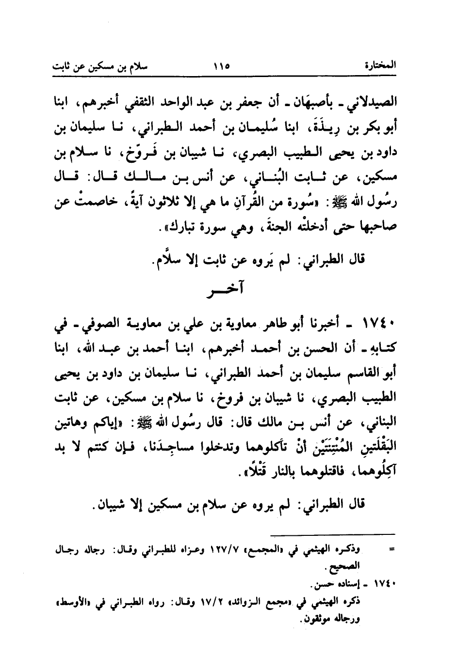1740 - أَخْبَرَنَا أَبُو طَاهِرٍ مُعَاوِيَةُ بْنُ عَلِيِّ بْنِ مُعَاوِيَةَ الصُّوفِيُّ فِي كِتَابِهِ أَنَّ الْحَسَنَ بْنَ أَحْمد أَخْبَرَهُمْ أبنا أَحْمَدُ بْنُ عَبْدِ اللَّهِ أبنا أَبُو الْقَاسِمِ سُلَيْمَانُ بْنُ أَحْمَدَ الطَّبَرَانِيُّ نَا سُلَيْمَانُ بْنُ دَاوُدَ بْنِ يَحْيَى الطَّبِيبُ الْبَصْرِيُّ نَا شَيْبَانُ بْنُ فَرُّوخَ نَا سَلامُ بْنُ مِسْكِينٍ عَنْ ثَابِتٍ الْبُنَانِيِّ عَنْ أَنَسِ بْنِ مَالِكٍ قَالَ قَالَ رَسُولُ اللَّهِ صَلَّى اللَّهُ عَلَيْهِ وَسَلَّمَ إِيَّاكُمْ وَهَاتَيْنِ الْبَقْلَتَيْنِ الْمُنْتِنَتَيْنِ أَنْ تَأْكُلُوهُمَا وَتَدْخُلُوا مَسَاجِدَنَا فَإِنْ كُنْتُمْ لَا بُدَّ آكِلُوهُمَا فَاقْتُلُوهُمَا بِالنَّارِ قَتْلا قَالَ الطَّبَرَانِيُّ لَمْ يَرْوِهِ عَنْ سَلامِ بْنِ مِسْكِينٍ إِلا شَيْبَانُ