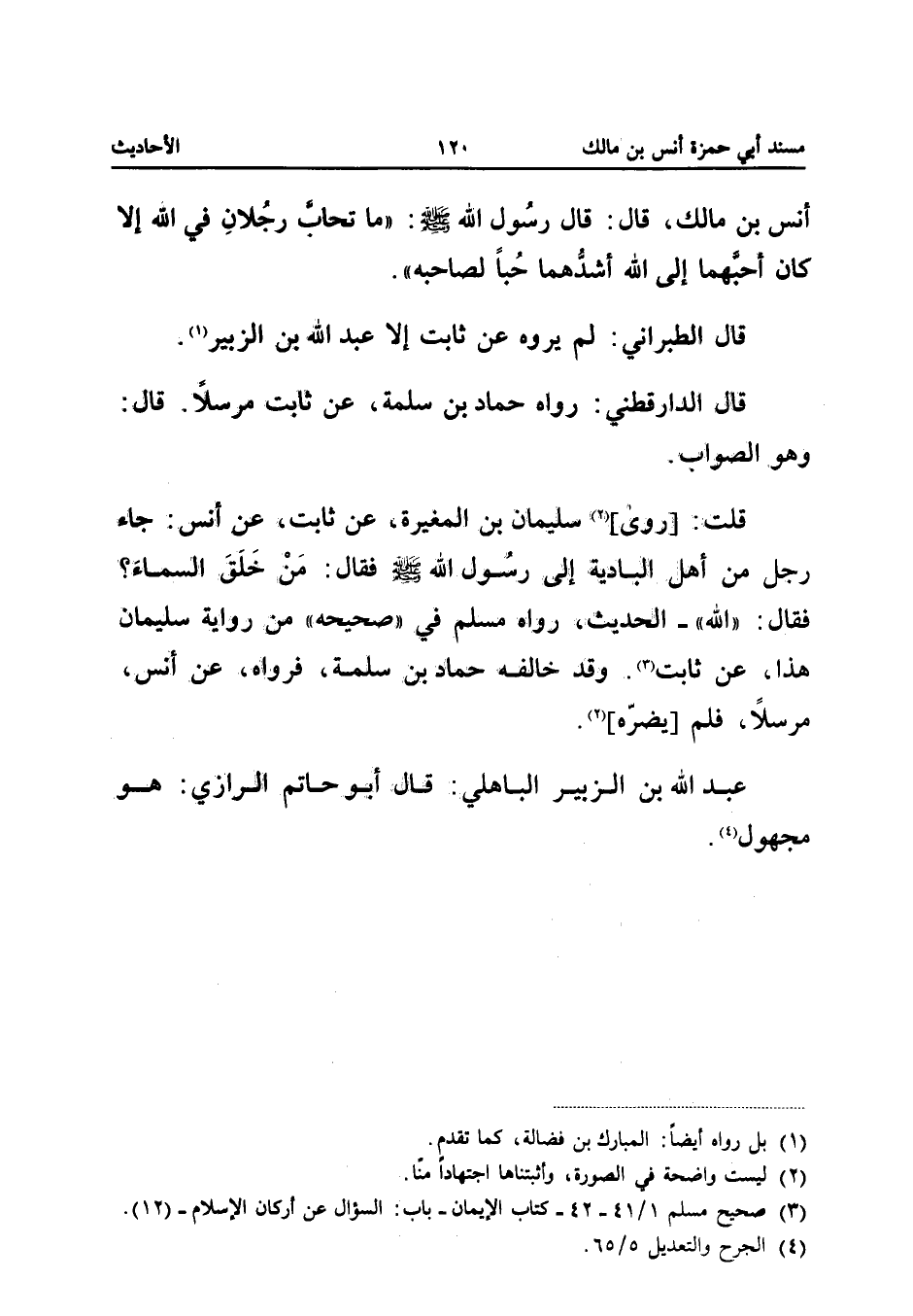 مَا تَحَابَّ رَجُلانِ فِي اللَّهِ إِلا كَانَ أَحَبُّهُمَا إِلَى اللَّهِ أَشَدَّهُمَا حُبًّا لِصَاحِبِهِ قَالَ الطَّبَرَانِيُّ لَمْ يَرْوِهِ عَنْ ثَابِتٍ إِلا عَبْدُ اللَّهِ بْنُ الزُّبَيْرِ قَالَ الدَّارَقُطْنِيُّ رَوَاهُ حَمَّادُ بْنُ سَلَمَةَ عَنْ ثَابِتٍ مُرْسَلا قَالَ وَهُوَ الصَّوَابُ قُلْتُ [رَوَى] سُلَيْمَانُ بْنُ الْمُغِيرَةِ عَنْ ثَابِتٍ عَنْ أَنَسٍ جَاءَ رَجُلٌ مِنْ أَهْلِ الْبَادِيَةِ إِلَى رَسُولِ اللَّهِ صَلَّى اللَّهُ عَلَيْهِ وَسَلَّمَ فَقَالَ مَنْ خَلَقَ السَّمَاءَ فَقَالَ اللَّهُ الْحَدِيثَ رَوَاهُ مُسْلِمٌ فِي صَحِيحِهِ مِنْ رِوَايَةِ سُلَيْمَانَ هَذَا عَنْ ثَابِتٍ وَقَدْ خَالَفَهُ حَمَّادُ بْنُ سَلَمَةَ فَرَوَاهُ عَنْ أَنَسٍ مُرْسَلا فَلَمْ [يَضُرَّهُ] عَبْدُ اللَّهِ بْنُ الزُّبَيْرِ الْبَاهِلِيُّ قَالَ أَبُو حَاتِمٍ الرَّازِيُّ هُوَ مَجْهُولٌ