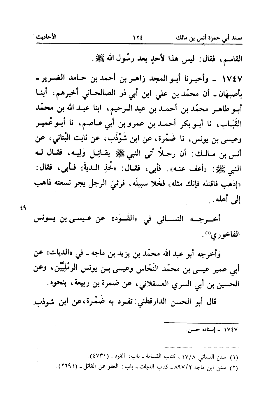 1747 - وَأَخْبَرَنَا أَبُو الْمَجْدِ زَاهِرُ بْنُ أَحْمَدَ بْنِ حَامِدٍ الضَّرِيرُ بِأَصْبَهَانَ أَنَّ مُحَمَّدَ بْنَ عَلِيِّ ابْن أَبِي ذَرٍّ الصَّالْحَانِيَّ أَخْبَرَهُمْ أبنا أَبُو طَاهِرٍ مُحَمَّدُ بْنُ أَحْمَدَ بْنِ عَبْدِ الرَّحِيمِ أبنا عَبْدُ اللَّهِ بْنُ مُحَمَّدٍ الْقَبَّابُ نَا أَبُو بَكْرٍ أَحْمَدُ بْنُ عَمْرِو بْنِ أَبِي عَاصِمٍ نَا أَبُو عُمَيْرٍ وَعِيسَى بْنِ يُونُسَ نَا ضَمْرَةُ عَنِ ابْنِ شَوْذَبٍ عَنْ ثَابِتٍ الْبُنَانِيِّ عَنْ أَنَسِ بْنِ مَالِكٍ أَنَّ رَجُلا أَتَى النَّبِيَّ صَلَّى اللَّهُ عَلَيْهِ وَسَلَّمَ بِقَاتِلِ وَلِيِّهِ فَقَالَ لَهُ النَّبِيُّ صَلَّى اللَّهُ عَلَيْهِ وَسَلَّمَ اعْفُ عَنْهُ فَأَبَى فَقَالَ خُذِ الدِّيَةَ فَأَبَى فَقَالَ إذهب فاقتله فَإنَّك مثله فَخَلا سَبِيلَهُ فَرُئِيَ الرَّجُلُ يَجُرُّ نِسْعَتَهُ ذَاهِبٌ إِلَى أَهْلِهِ أَخْرَجَهُ النَّسَائِيُّ فِي الْقَوَدِ عَنْ عِيسَى بْنِ يُونُسَ الْفَاخُورِيِّ وَأَخْرَجَهُ أَبُو عَبْدِ اللَّهِ مُحَمَّدُ بْنُ يَزِيدَ بْنِ مَاجَهْ فِي الدِّيَاتِ عَنْ أَبِي عُمَيْرٍ عِيسَى بْنِ مُحَمَّدٍ النَّحَّاسِ وَعِيسَى بْنِ يُونُسَ الرَّمْلِيَّيْنِ وَعَنِ الْحُسَيْنِ بْنِ أَبِي السَّرِيِّ الْعَسْقَلانِيِّ عَنْ ضَمْرَةَ بْنِ رَبِيعَةَ بِنَحْوِهِ قَالَ أَبُو الْحَسَنِ الدَّارَقُطْنِيُّ تَفَرَّدَ بِهِ ضَمْرَةُ عَنِ ابْنِ شَوْذَبٍ