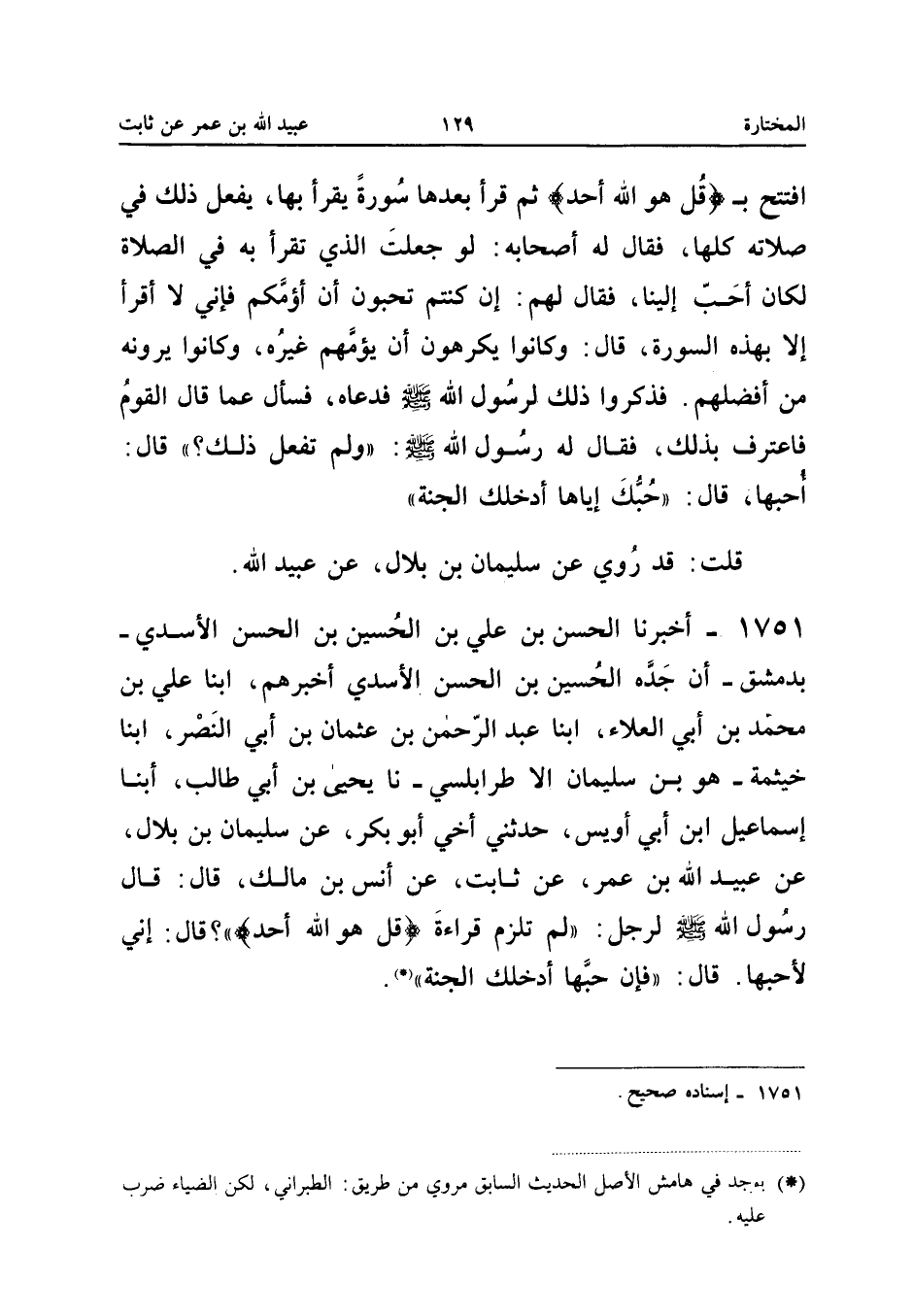 1751 - أَخْبَرَنَا الْحَسَنُ بْنُ عَلِيِّ بْنِ الْحُسَيْنِ بْنِ الْحَسَنِ الأَسَدِيُّ بِدِمَشْقَ أَنَّ جَدَّهُ الْحُسَيْنَ بْنَ الْحَسَنِ الأَسَدِيَّ أَخْبَرَهُمْ أبنا عَلِيُّ بْنُ مُحَمَّدٍ بن أبي الْعَلَاء ابْنا عَبْدُ الرَّحْمَنِ بْنُ عُثْمَانَ بْنِ أَبِي النَّصْرِ ابْنا خَيْثَمَة هُوَ بن سُلَيْمَان الاطرابلسي نَا يحيى بن أبي طَالب أبنا إِسْمَاعِيل ابْن أَبِي أُوَيْسٍ حَدَّثَنِي أَخِي أَبُو بَكْرٍ عَنْ سُلَيْمَانَ بْنِ بِلالٍ عَنْ عُبَيْدِ اللَّهِ بْنِ عُمَرَ عَنْ ثَابِتٍ عَنْ أَنَسِ بْنِ مَالِكٍ قَالَ قَالَ رَسُولُ اللَّهِ صَلَّى اللَّهُ عَلَيْهِ وَسَلَّمَ لِرَجُلٍ لِمَ تَلْزَمْ قِرَاءَةَ {قُلْ هُوَ اللَّهُ أَحَدٌ} قَالَ إِنِّي لأُحِبُّهَا قَالَ فَإِنَّ حُبَّهَا أَدْخَلَكَ الْجَنَّةَ