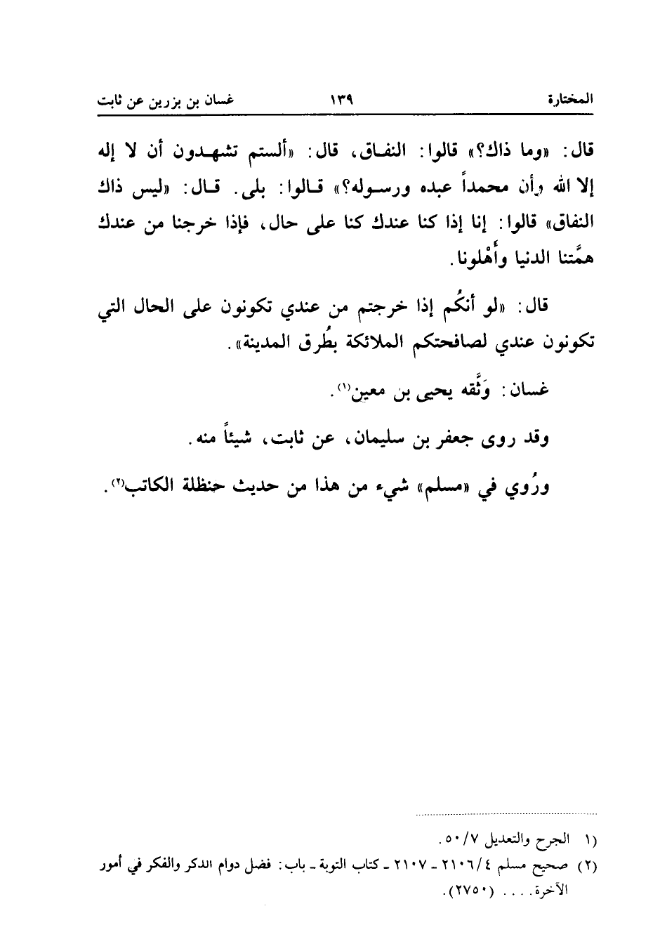 قَالَ وَمَا ذَاكَ قَالُوا النِّفَاقُ قَالَ أَلَسْتُمْ تَشْهَدُونَ أَنْ لَا إِلَهَ إِلا اللَّهُ وَأَنَّ مُحَمَّدًا عَبْدُهُ وَرَسُولُهُ قَالُوا بَلَى قَالَ لَيْسَ ذَاكَ النِّفَاقَ قَالُوا إِنَّا إِذَا كُنَّا عِنْدَكَ كُنَّا عَلَى حَالٍ فَإِذَا خَرَجْنَا مِنْ عِنْدِكَ هَمَّتْنَا الدُّنْيَا وَأَهْلُونَا قَالَ لَوْ أَنَّكُمْ إِذَا خَرَجْتُمْ مِنْ عِنْدِي تَكُونُونَ عَلَى الْحَالِ الَّتِي تَكُونُونَ عِنْدِي لَصَافَحَتْكُمُ الْمَلائِكَةُ بِطُرُقِ الْمَدِينَةِ غَسَّانُ وَثَّقَهُ يَحْيَى بْنُ مَعِينٍ وَقَدْ رَوَى جَعْفَرُ بْنُ سُلَيْمَانَ عَنْ ثَابِتٍ شَيْئًا مِنْهُ وَرُوِيَ فِي مُسْلِمٍ شَيْءٌ مِنْ هَذَا مِنْ حَدِيثِ حَنْظَلَة الْكَاتِب