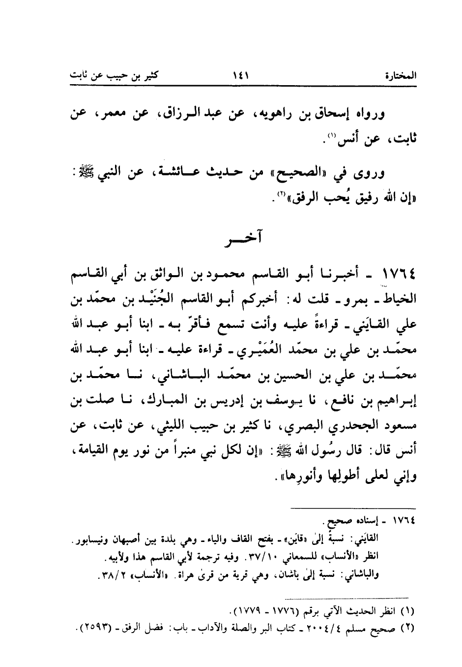 1764 - أَخْبَرَنَا أَبُو الْقَاسِمِ مَحْمُودُ بْنُ الْوَاثِقِ بْنِ أَبِي الْقَاسِمِ الْخَيَّاطُ بِمَرْوَ قُلْتَ لَهُ أَخْبَرَكُمْ أَبُو الْقَاسِمِ الْجُنَيْدُ بْنُ مُحَمَّدِ بْنِ عَلِيٍّ الْقَايِنِيُّ قِرَاءَةً عَلَيْهِ وَأَنْتَ تَسْمَعُ فَأَقَرَّ بِهِ أبنا أَبُو عَبْدِ اللَّهِ مُحَمَّدُ بْنُ عَلِيِّ بن مُحَمَّد العميري قِرَاءَةً عَلَيْهِ أبنا أَبُو عَبْدِ اللَّهِ مُحَمَّدُ بْنُ عَلِيِّ بْنِ الْحُسَيْنِ بْنِ مُحَمَّدٍ الْبَاشَانِيُّ نَا مُحَمَّدُ بْنُ إِبْرَاهِيمَ بْنِ نَافِعٍ نَا يُوسُفُ بْنُ إِدْرِيسَ بْنِ الْمُبَارَكِ نَا صَلْتُ بْنُ مَسْعُودٍ الْجَحْدَرِيُّ الْبَصْرِيُّ نَا كَثِيرُ بْنُ حَبِيبٍ اللَّيْثِيُّ عَنْ ثَابِتٍ عَنْ أَنَسٍ قَالَ قَالَ رَسُولُ اللَّهِ صَلَّى اللَّهُ عَلَيْهِ وَسَلَّمَ إِنَّ لِكُلِّ نَبِيٍّ مِنْبَرًا مِنْ نُورٍ يَوْمَ الْقِيَامَة وَإِنِّي لعلى أطولها وأنورها