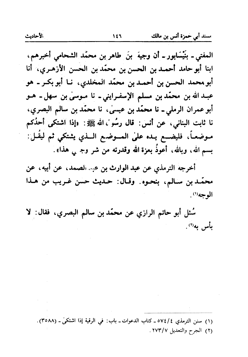 إِذا اشْتَكَى أحدكُم وضعا فَلْيَضَعْ يَدَهُ عَلَى الْمَوْضِعِ الَّذِي يَشْتَكِي ثُمَّ لِيَقُلْ بِسْمِ اللَّهِ وَبِاللَّهِ أَعُوذُ بِعِزَّةِ اللَّهِ وَقُدْرَتِهِ مِنْ شَرِّ وَجَعِي هَذَا أَخْرَجَهُ التِّرْمِذِيُّ عَنْ عَبْدِ الْوَارِثِ بْنِ عَبْدِ الصَّمَدِ عَنْ أَبِيهِ عَنْ مُحَمَّدِ بْنِ سَالِمٍ بِنَحْوِهِ وَقَالَ حَدِيثٌ حَسَنٌ غَرِيبٌ مِنْ هَذَا الْوَجْهِ سُئِلَ أَبُو حَاتِمٍ الرَّازِيُّ عَنْ مُحَمَّدِ بْنِ سَالِمٍ الْبَصْرِيِّ فَقَالَ لَا بَأْسَ بِهِ