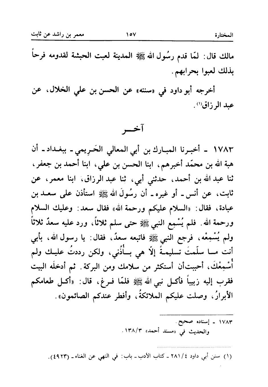 1783 - أَخْبَرَنَا الْمُبَارَكُ بْنُ أَبِي الْمَعَالِي الْحَرِيمِيُّ بِبَغْدَادَ أَنَّ هِبَةَ اللَّهِ بْنَ مُحَمَّدٍ أَخْبَرَهُمْ أبنا الْحَسَنُ بْنُ عَلِيٍّ ابْنَا أَحْمَدَ بْنِ جَعْفَرٍ ثَنَا عَبْدُ اللَّهِ بْنُ أَحْمَدَ حَدَّثَنِي أَبِي ثَنَا عَبْدُ الرَّزَّاقِ أبنا مَعْمَرٌ عَنْ ثَابِتٍ عَنْ أَنَسٍ أَوْ غَيْرِهِ أَنَّ رَسُولَ اللَّهِ صَلَّى اللَّهُ عَلَيْهِ وَسَلَّمَ اسْتَأْذَنَ عَلَى سَعْدِ بْنِ عُبَادَةَ فَقَالَ السَّلامُ عَلَيْكُمْ وَرَحْمَةُ اللَّهِ فَقَالَ سَعْدٌ وَعَلَيْكَ السَّلامُ وَرَحْمَةُ اللَّهِ فَلَمْ يَسْمَعِ النَّبِيُّ صَلَّى اللَّهُ عَلَيْهِ وَسَلَّمَ حَتَّى سَلَّمَ ثَلاثًا وَرَدَّ عَلَيْهِ سَعْدٌ ثَلاثًا وَلَمْ يُسْمِعْهُ فَرَجَعَ النَّبِيُّ صَلَّى اللَّهُ عَلَيْهِ وَسَلَّمَ فَاتَّبَعَهُ سَعْدٌ فَقَالَ يَا رَسُولَ اللَّهِ بِأَبِي أَنْت مَا سملت تَسْلِيمَةً إِلا هِيَ بِأُذُنِي وَلَكِنْ رَدَدْتُ عَلَيْكَ وَلَمْ أُسْمِعْكَ أَحْبَبْتُ أَنْ أَسْتَكْثِرَ مِنْ سَلامِكَ وَمِنَ الْبَرَكَةِ ثُمَّ أَدْخَلَهُ الْبَيْتَ فَقَرَّبَ إِلَيْهِ زَبِيبًا فَأَكَلَ نَبِيُّ اللَّهِ صَلَّى اللَّهُ عَلَيْهِ وَسَلَّمَ فَلَمَّا فَرَغَ قَالَ أَكَلَ طَعَامَكُمُ الأَبْرَارُ وصلت عَلَيْكُم الْمَلَائِكَة وَأفْطر عنْدكُمْ الصائمون