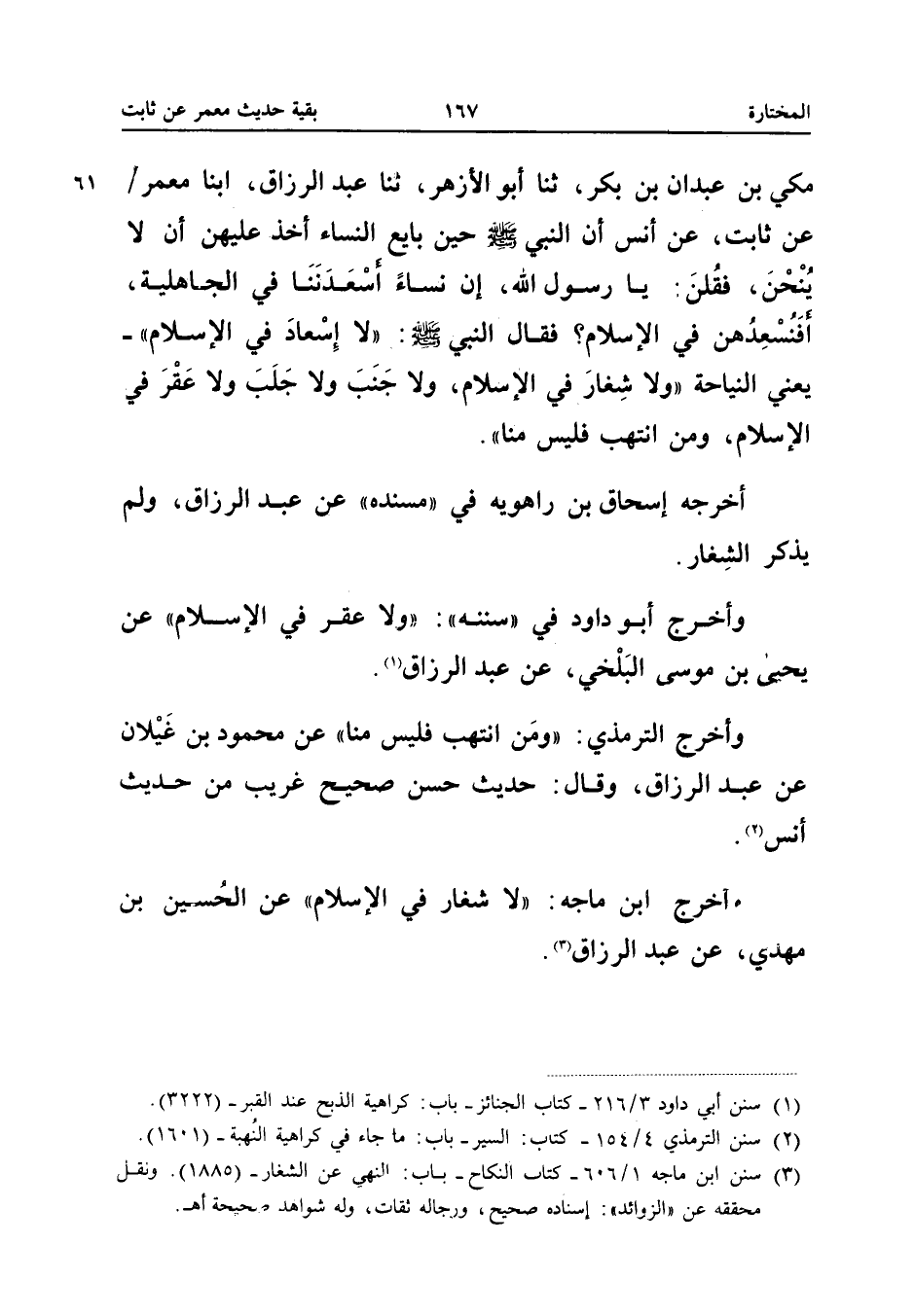 حِين بَايع النِّسَاء أَخذ عَلَيْهِنَّ أَن يَنُحْنَ فَقُلْنَ يَا رَسُولَ اللَّهِ إِنَّ نِسَاءً أَسْعَدْنَنَا فِي الْجَاهِلِيَّةِ أَفَنُسْعِدُهُنَّ فِي الإِسْلامِ فَقَالَ النَّبِيُّ صَلَّى اللَّهُ عَلَيْهِ وَسَلَّمَ لَا إِسْعَادَ فِي الإِسْلامِ يَعْنِي النِّيَاحَةَ وَلا شِغَارَ فِي الإِسْلامِ وَلا جَنَبَ وَلا جَلَبَ وَلا عَقْرَ فِي الإِسْلامِ وَمَنِ انْتَهَبَ فَلَيْسَ مِنَّا أَخْرَجَهُ إِسْحَاقُ بْنُ رَاهُوَيْهِ فِي مُسْنَدِهِ عَنْ عَبْدِ الرَّزَّاقِ وَلَمْ يَذْكُرِ الشِّغَارَ وَأَخْرَجَ أَبُو دَاوُدَ فِي سُنَنِهِ وَلا عَقْرَ فِي الإِسْلامِ عَنْ يَحْيَى بْنِ مُوسَى الْبَلْخِيِّ عَنْ عَبْدِ الرَّزَّاقِ وَأَخْرَجَ التِّرْمِذِيُّ وَمَنِ انْتَهَبَ فَلَيْسَ مِنَّا عَنْ مَحْمُودِ بْنِ غَيْلانَ عَنْ عَبْدِ الرَّزَّاقِ وَقَالَ حَدِيثٌ حَسَنٌ صَحِيحٌ غَرِيبٌ مِنْ حَدِيثِ أَنَسٍ وَأَخْرَجَ ابْنُ مَاجَهْ لَا شِغَارَ فِي الإِسْلامِ عَنِ الْحُسَيْنِ بْنِ مَهْدِيٍّ عَنْ عَبْدِ الرَّزَّاقِ