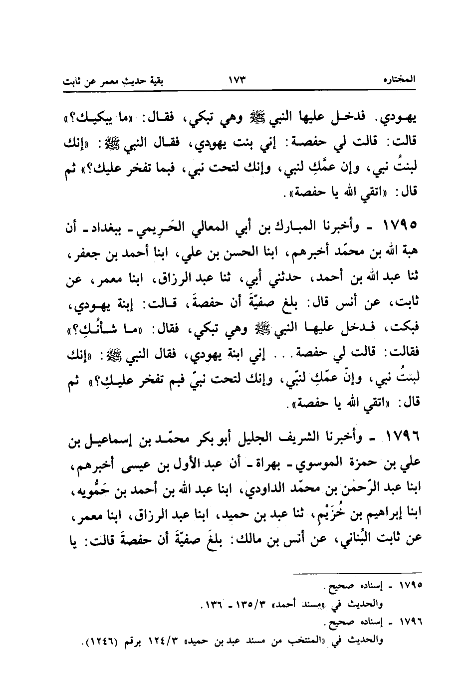 1795 - وَأَخْبَرَنَا الْمُبَارَكُ بْنُ أَبِي الْمَعَالِي الْحَرِيمِيُّ بِبَغْدَادَ أَنَّ هِبَةَ اللَّهِ بْنَ مُحَمَّدٍ أَخْبَرَهُمْ أبنا الْحَسَنُ بْنُ عَلِيٍّ ابْنَا أَحْمَدَ بْنِ جَعْفَرٍ ثَنَا عَبْدُ اللَّهِ بْنُ أَحْمَدَ حَدَّثَنِي أَبِي ثَنَا عَبْدُ الرَّزَّاقِ أبنا مَعْمَرٌ عَنْ ثَابِتٍ عَنْ أَنَسٍ قَالَ بَلَغَ صَفِيَّةَ أَنَّ حَفْصَةَ قَالَتْ ابْنَةُ يَهُودِيٍّ فَبَكَتْ فَدَخَلَ عَلَيْهَا النَّبِيُّ صَلَّى اللَّهُ عَلَيْهِ وَسَلَّمَ وَهِيَ تَبْكِي فَقَالَ مَا شَأْنُكِ فَقَالَتْ قَالَتْ لِي حَفْصَةُ إِنِّي ابْنَةُ يَهُودِيٍّ فَقَالَ النَّبِيُّ صَلَّى اللَّهُ عَلَيْهِ وَسَلَّمَ إِنَّكِ لَبِنْتُ نَبِيٍّ وَإِنَّ عَمَّكِ لَنَبِيٌّ وَإِنَّكِ لَتَحْتَ نَبِيٍّ فَبِمَ تَفْخَرُ عَلَيْكِ ثُمَّ قَالَ اتقِي الله يَا حَفْصَة إِسْنَاده صَحِيح