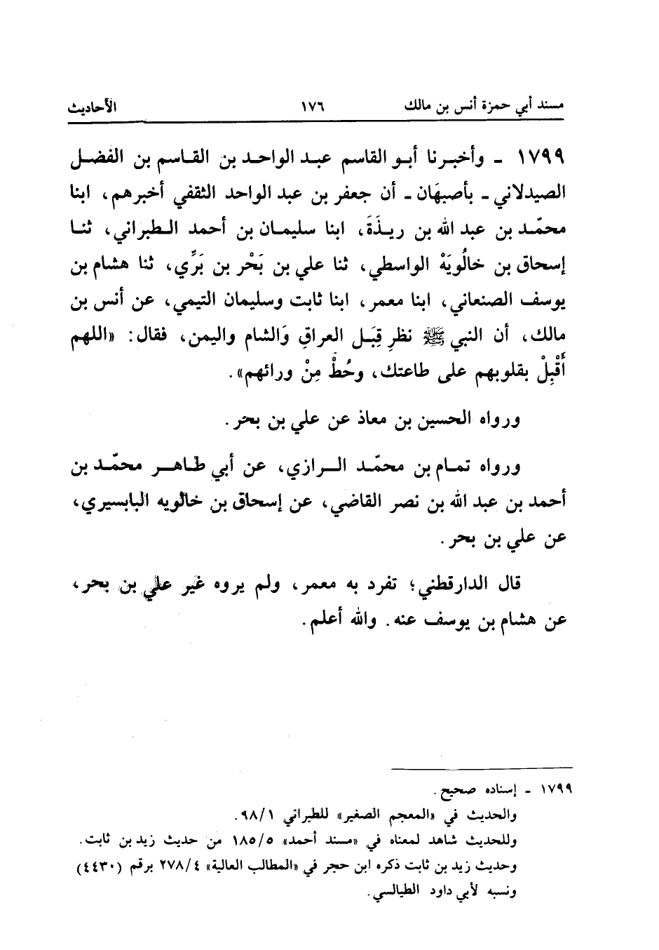 1799 - وَأَخْبَرَنَا أَبُو الْقَاسِمِ عَبْدُ الْوَاحِدِ بْنُ الْقَاسِمِ بْنِ الْفَضْلِ الصَّيْدَلانِيُّ بِأَصْبَهَانَ أَنَّ جَعْفَرَ بْنَ عَبْدِ الْوَاحِدِ الثَّقَفِيَّ أَخْبَرَهُمْ أبنا مُحَمَّدُ بْنُ عَبْدِ اللَّهِ بْنِ رِيذَةَ أبنا سُلَيْمَانُ بْنُ أَحْمَدَ الطَّبَرَانِيُّ ثَنَا إِسْحَاقُ بْنُ خَالَوَيْهِ الْوَاسِطِيُّ ثَنَا عَلِيُّ بْنُ بَحْرِ بْنِ بَرِيٍّ ثَنَا هِشَام بن يُوسُف الصَّنْعَانِيّ ابْنا معمر ابْنا ثَابِتٌ وَسُلَيْمَانُ التَّيْمِيُّ عَنْ أَنَسِ بْنِ مَالِكٍ أَنَّ النَّبِيَّ صَلَّى اللَّهُ عَلَيْهِ وَسَلَّمَ نَظَرَ قِبَلَ الْعِرَاقِ وَالشَّامِ وَالْيَمَنِ فَقَالَ اللَّهُمَّ أَقْبِلْ بِقُلُوبِهِمْ عَلَى طَاعَتِكَ وَحِطْ مَنْ وَرَائِهِمْ وَرَوَاهُ الْحُسَيْنُ بْنُ مُعَاذٍ عَنْ عَلِيِّ بْنِ بَحْرٍ وَرَوَاهُ تَمَّامُ بْنُ مُحَمَّدٍ الرَّازِيُّ عَنْ أَبِي طَاهِرٍ مُحَمَّدُ بْنُ أَحْمَدَ بْنِ عَبْدِ اللَّهِ بْنِ نَصْرٍ الْقَاضِي عَنْ إِسْحَاقَ بْنِ خَالَوَيْهِ الْبَابَسِيرِيِّ عَنْ عَلِيِّ بْنِ بَحْرٍ قَالَ الدَّارَقُطْنِيُّ تَفَرَّدَ بِهِ مَعْمَرٌ وَلَمْ يَرْوِهِ غَيْرُ عَلِيِّ بْنِ بَحْرٍ عَنْ هِشَامِ بْنِ يُوسُفَ عَنْهُ وَالله أعلم