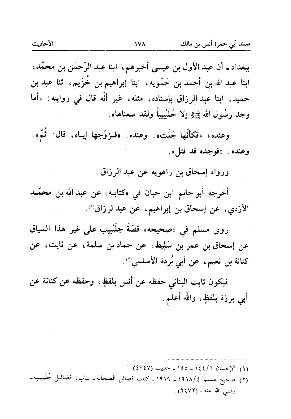 إِلا جُلَيْبِيبًا وَلَقَدْ مَنَعْنَاهَا وَعِنْدَهُ فَكَأَنَّهَا جَلَّتْ وَعِنْدَهُ فَزَوَّجَهَا إِيَّاهُ قَالَ ثُمَّ وَعِنْدَهُ فَوَجَدَهُ قَدْ قُتِلَ وَرَوَاهُ إِسْحَاقُ بْنُ رَاهَوَيْهِ عَنْ عبد الرَّزَّاق أخرجه أَبُو حَاتِمِ ابْنُ حِبَّانَ فِي كِتَابِهِ عَنْ عَبْدِ اللَّهِ بُن مُحَمَّدٍ الأَزْدِيِّ عَنْ إِسْحَاقَ بْنِ إِبْرَاهِيمَ عَنْ عَبْدِ الرَّزَّاقِ رَوَى مُسْلِمٌ فِي صَحِيحِهِ قِصَّةَ جُلَيْبِيبٍ عَلَى غَيْرِ هَذَا السِّيَاقِ عَنْ إِسْحَاقَ بْنِ عُمَرَ بْنِ سَلِيطٍ عَنْ حَمَّادِ بْنِ سَلَمَةَ عَنْ ثَابِتٍ عَنْ كِنَانَةَ بْنِ نُعَيْمٍ عَنْ أَبِي بُرْدَةَ الأَسْلَمِيِّ فَيَكُونُ ثَابِتٌ الْبُنَانِيُّ حَفِظَهُ عَنْ أَنَسٍ بِلَفْظٍ وَحَفِظَهُ عَنْ كِنَانَةَ عَنْ أَبِي بَرْزَةَ بِلَفْظٍ وَالله أعلم