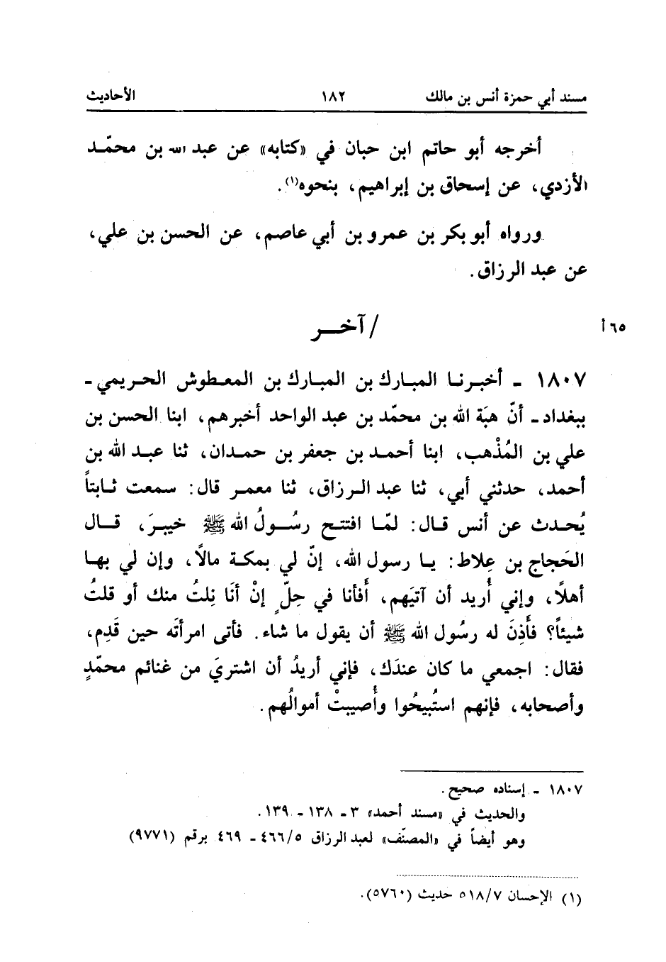 1807 - أَخْبَرَنَا الْمُبَارَكُ بْنُ الْمُبَارَكِ بْنِ الْمَعْطُوشِ الْحَرِيمِيُّ بِبَغْدَادَ أَنَّ هِبَةَ اللَّهِ بْنَ مُحَمَّدِ بْنِ عَبْدِ الْوَاحِدِ أَخْبَرَهُمْ أبنا الْحَسَنُ بْنُ عَلِيٍّ بن الْمُذْهِبِ أبنا أَحْمَدُ بْنُ جَعْفَرِ بْنِ حَمْدَانَ ثَنَا عَبْدُ اللَّهِ بْنُ أَحْمَدَ حَدَّثَنِي أَبِي ثَنَا عَبْدُ الرَّزَّاقِ ثَنَا مَعْمَرٌ قَالَ سَمِعْتُ ثَابِتًا يُحَدِّثُ عَنْ أَنَسٍ قَالَ لَمَّا افْتَتَحَ رَسُولُ اللَّهِ صَلَّى اللَّهُ عَلَيْهِ وَسَلَّمَ خَيْبَرَ قَالَ الْحَجَّاجُ بْنُ علاطٍ يَا رَسُولَ اللَّهِ إِنَّ لِي بِمَكَّةَ مَالا وَإِنَّ لِي بِهَا أَهْلا وَإِنِّي أُرِيدُ أَنْ آتِيهِمْ أَفَأَنَا فِي حِلٍّ إِنْ أَنَا نِلْتُ مِنْكَ أَوْ قُلْتُ شَيْئًا فَأَذِنَ لَهُ رَسُولُ اللَّهِ صَلَّى اللَّهُ عَلَيْهِ وَسَلَّمَ أَنْ يَقُولَ مَا شَاءَ فَأَتَى امْرَأَتَهُ حِينَ قَدِمَ فَقَالَ اجْمَعِي مَا كَانَ عِنْدَكِ فَإِنِّي أُرِيدُ أَنْ أَشْتَرِيَ مِنْ غَنَائِمِ مُحَمَّدٍ وَأَصْحَابِهِ فَإِنَّهُمُ اسْتُبِيحُوا وَأُصِيبَ أَمْوَالُهُمْ
