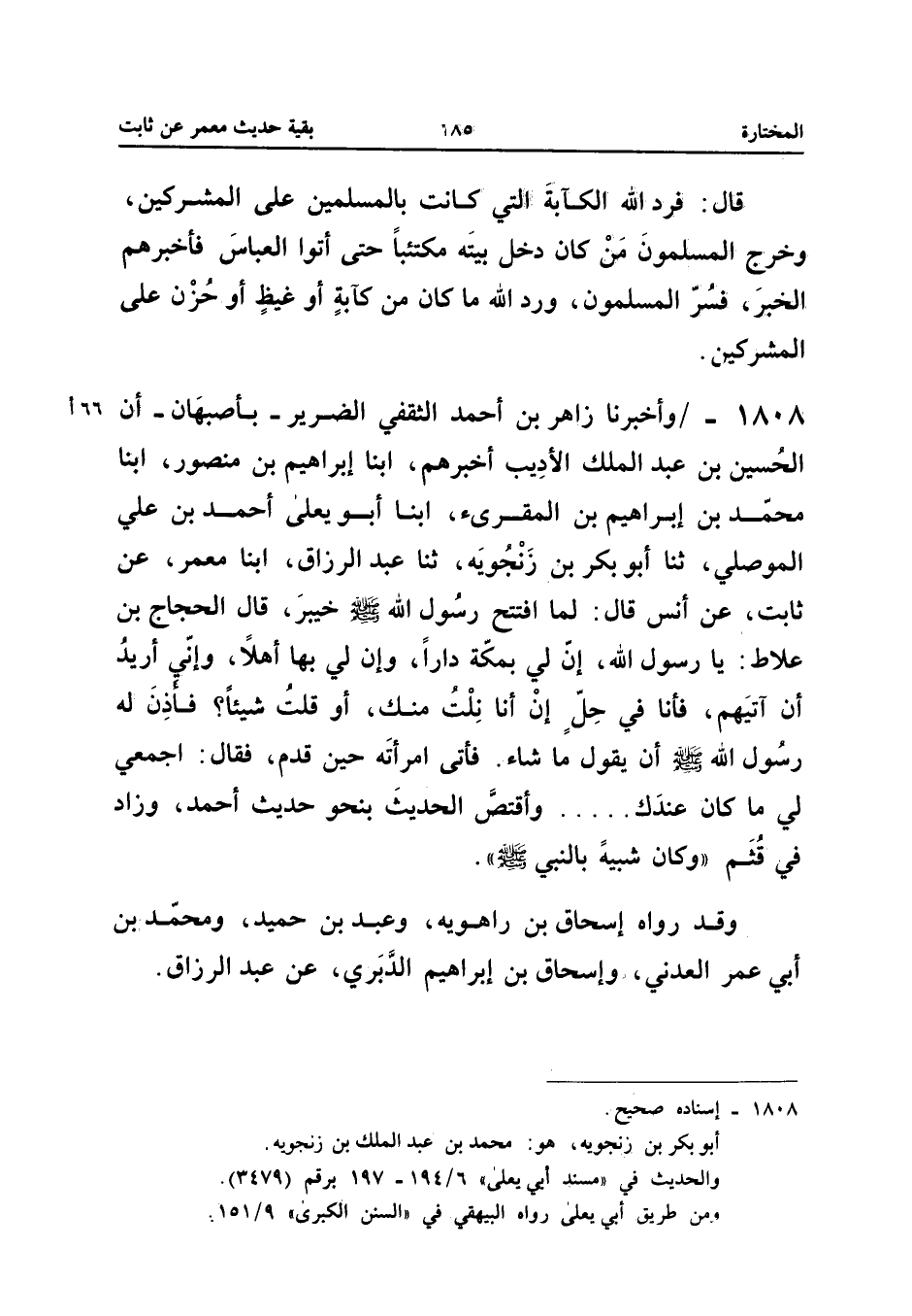 1808 - وَأَخْبَرَنَا زَاهِرُ بْنُ أَحْمَدَ الثَّقَفِيُّ الضَّرِيرُ بِأَصْبَهَانَ أَنَّ الْحُسَيْنَ بْنَ عَبْدِ الْمَلِكِ الأَدِيبَ أَخْبَرَهُمْ أبنا إِبْرَاهِيمُ بْنُ مَنْصُورٍ أبنا مُحَمَّدُ بْنُ إِبْرَاهِيم بن المقريء أبنا أَبُو يَعْلَى أَحْمَدُ بْنُ عَلِيٍّ الْمَوْصِلِيُّ ثَنَا أَبُو بَكْرِ بْنُ زَنْجُوَيْهِ ثَنَا عَبْدُ الرَّزَّاق ابْنا مَعْمَرٌ عَنْ ثَابِتٍ عَنْ أَنَسٍ قَالَ لَمَّا افْتَتَحَ رَسُولُ اللَّهِ صَلَّى اللَّهُ عَلَيْهِ وَسَلَّمَ خَيْبَرَ قَالَ الْحَجَّاجُ بْنُ علاطٍ يَا رَسُولَ اللَّهِ إِنَّ لِي بِمَكَّةَ دَارًا وَإِنَّ لِي بِهَا أَهْلا وَإِنِّي أُرِيدُ أَنْ آتِيَهُمْ فَأَنَا فِي حِلٍّ إِنْ أَنَا نِلْتُ مِنْكَ أَوْ قُلْتُ شَيْئًا فَأَذِنَ لَهُ رَسُولُ اللَّهِ صَلَّى اللَّهُ عَلَيْهِ وَسَلَّمَ أَنْ يَقُولَ مَا شَاءَ فَأَتَى امْرَأَتَهُ حِينَ قَدِمَ فَقَالَ اجْمَعِي لِي مَا كَانَ عِنْدَكِ وَاقْتَصَّ الْحَدِيثَ بِنَحْوِ حَدِيثِ أَحْمد وَزَاد فِي قثم وَكَانَ شبية بِالنَّبِيِّ صَلَّى اللَّهُ عَلَيْهِ وَسَلَّمَ وَقَدْ رَوَاهُ إِسْحَاقُ بن رَاهَوَيْه وَعبد بْنُ حُمَيْدٍ وَمُحَمَّدُ بْنُ أَبِي عُمَرَ الْعَدَنِيُّ وَإِسْحَاقُ بْنُ إِبْرَاهِيمَ الدَّبَرِيُّ عَنْ عَبْدِ الرَّزَّاقِ