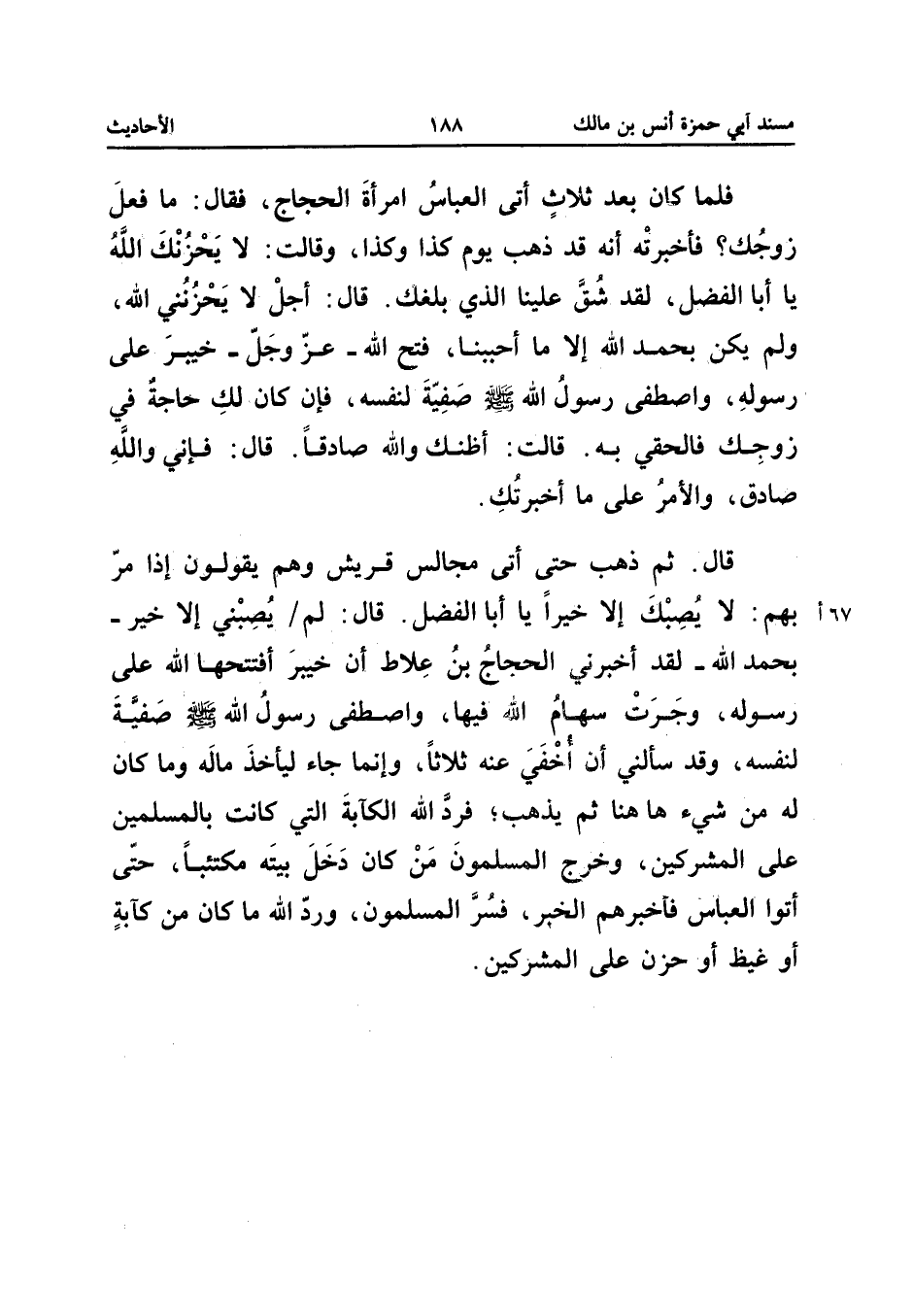 فَلَمَّا كَانَ بَعْدَ ثَلاثٍ أَتَى الْعَبَّاسُ امْرَأَةَ الْحَجَّاجِ فَقَالَ مَا فَعَلَ زَوْجُكِ فَأَخَبْرَتْهُ أَنَّهُ قَدْ ذَهَبَ يَوْمَ كَذَا وَكَذَا وَقَالَتْ لَا يَحْزُنْكَ اللَّهُ يَا أَبَا الْفَضْلِ لَقَدْ شَقَّ عَلَيْنَا الَّذِي بَلَغَكَ قَالَ أَجَلْ لَا يَحْزُنُنِي اللَّهُ وَلَمْ يَكُنْ بِحَمْدِ اللَّهِ إِلا مَا أَحْبَبْنَا فَتَحَ اللَّهُ عَزَّ وَجَلَّ خَيْبَرَ عَلَى رَسُولِهِ وَاصْطَفَى رَسُولُ اللَّهِ صَلَّى اللَّهُ عَلَيْهِ وَسَلَّمَ صَفِيَّةَ لِنَفْسِهِ فَإِنَّ كَانَ لَكَ حَاجَةٌ فِي زَوْجِكِ فَالْحَقِي بِهِ قَالَتْ أَظُنُّكَ وَاللَّهِ صَادِقًا قَالَ فَإِنِّي وَاللَّهِ صَادِقٌ وَالأَمْرُ عَلَى مَا أَخْبَرْتُكِ قَالَ ثُمَّ ذَهَبَ حَتَّى أَتَى مَجَالِسَ قُرَيْشٍ وَهُمْ يَقُولُونَ إِذَا مَرَّ بِهِمْ لَا يصبك إِلَّا خيرا يَا أَبَا الْفَضْلِ قَالَ لَمْ يُصِبْنِي إِلا خَيْرٌ بِحَمْدِ اللَّهِ لَقَدْ أَخْبَرَنِي الْحَجَّاجُ بْنُ عِلاطٍ أَنَّ خَيْبَرَ افْتَتَحَهَا اللَّهُ عَلَى رَسُولِهِ وَجَرَتْ سِهَامُ اللَّهِ فِيهَا وَاصْطَفَى رَسُولُ اللَّهِ صَلَّى اللَّهُ عَلَيْهِ وَسَلَّمَ صَفِيَّةَ لِنَفْسِهِ وَقَدْ سَأَلَنِي أَنْ أُخْفِيَ عَنْهُ ثَلاثًا وَإِنَّمَا جَاءَ لِيَأْخُذَ مَالَهُ وَمَا كَانَ لَهُ مِنْ شَيْءٍ هَا هُنَا ثُمَّ يَذْهَبُ فَرَدَّ اللَّهُ الْكَآبَةَ الَّتِي كَانَتْ بِالْمُسْلِمِينَ عَلَى الْمُشْرِكِينَ وَخَرَجَ الْمُسْلِمُونَ مَنْ كَانَ دَخَلَ بَيْتَهُ مُكْتَئِبًا حَتَّى أَتَوُا الْعَبَّاسَ فَأَخْبَرَهُمُ الْخَبَرَ فَسُرَّ الْمُسْلِمُونَ وَرَدَّ اللَّهُ مَا كَانَ مِنْ كَآبَةٍ أَوْ غَيْظٍ أَوْ حُزْنٍ عَلَى الْمُشْركين