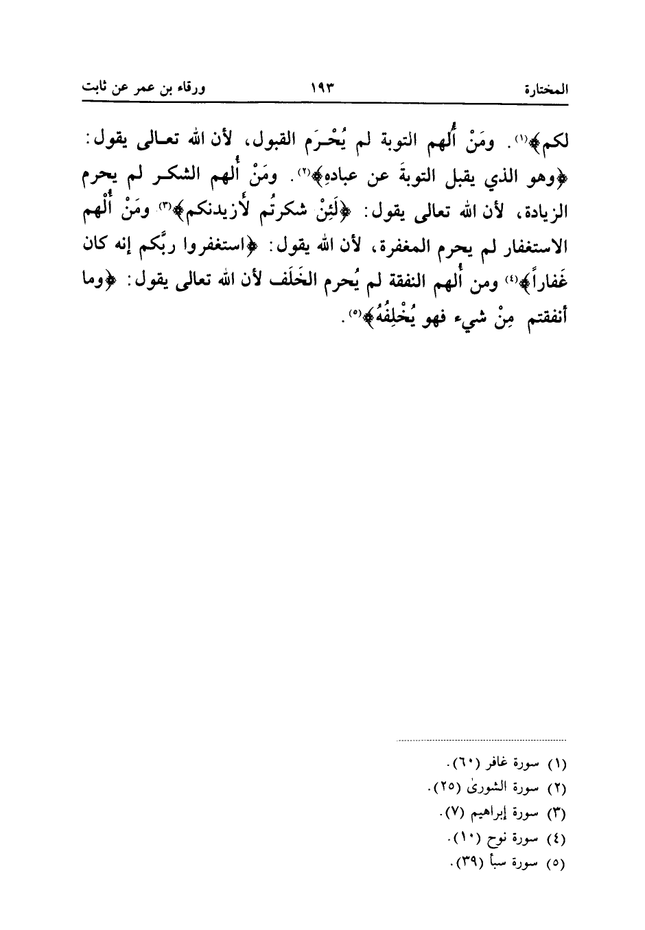 {لكم} وَمَنْ أُلْهِمَ التَّوْبَةَ لَمْ يُحْرَمِ الْقُبُولَ لأَنَّ اللَّهَ تَعَالَى يَقُولُ {وَهُوَ الَّذِي يَقْبَلُ التَّوْبَةَ عَن عباده} وَمَنْ أُلْهِمَ الشُّكْرَ لَمْ يُحْرَمِ الزِّيَادَةَ لأَنَّ الله تَعَالَى يَقُول {لَئِن شكرتم لأزيدنكم} وَمَنْ أُلْهِمَ الاسْتِغْفَارَ لَمْ يُحْرَمِ الْمَغْفِرَةَ لأَنَّ اللَّهَ يَقُولُ {اسْتَغْفِرُوا رَبَّكُمْ إِنَّهُ كَانَ غَفَّارًا} وَمَنْ أُلْهِمَ النَّفَقَةَ لَمْ يُحْرَمِ الْخَلَفَ لأَنَّ اللَّهَ تَعَالَى يَقُولُ وَمَا أَنْفَقْتُمْ مِنْ شَيْءٍ فَهُوَ يخلفه
