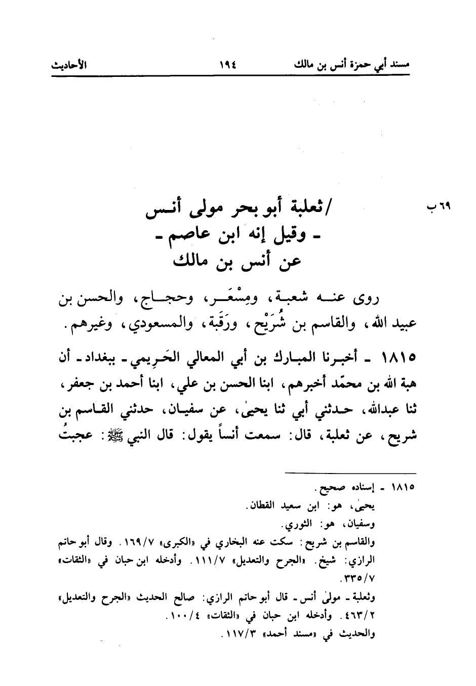 1815 - أَخْبَرَنَا الْمُبَارَكُ بْنُ أَبِي الْمَعَالِي الْحَرِيمِيُّ بِبَغْدَادَ أَنَّ هِبَةَ اللَّهِ بْنَ مُحَمَّدٍ أَخْبَرَهُمْ أبنا الْحَسَنُ بْنُ عَلِيٍّ ابْنَا أَحْمَدَ بْنِ جَعْفَرٍ ثَنَا عَبْدُ اللَّهِ حَدَّثَنِي أَبِي ثَنَا يَحْيَى عَنْ سُفْيَانَ حَدَّثَنِي الْقَاسِمُ بْنُ شُرَيْحٍ عَنْ ثَعْلَبَةَ قَالَ سَمِعْتُ أَنَسًا يَقُولُ قَالَ النَّبِيُّ صَلَّى اللَّهُ عَلَيْهِ وَسَلَّمَ عَجِبْتُ