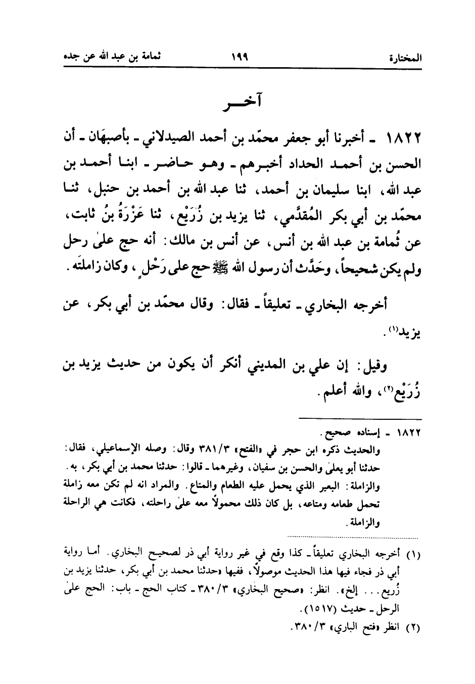 1822 - أَخْبَرَنَا أَبُو جَعْفَرٍ مُحَمَّدُ بْنُ أَحْمَدَ الصَّيْدَلانِيُّ بِأَصْبَهَانَ أَنَّ الْحَسَنَ بْنَ أَحْمَدَ الْحَدَّادَ أَخْبَرَهُمْ وَهُوَ حَاضِرٌ أبنا أَحْمَدُ بْنُ عَبْدِ اللَّهِ أبنا سُلَيْمَانُ بْنُ أَحْمَدَ ثَنَا عَبْدُ اللَّهِ بْنُ أَحْمَدَ بْنِ حَنْبَلٍ ثَنَا مُحَمَّدُ بْنُ أَبِي بَكْرٍ الْمُقَدَّمِيُّ ثَنَا يَزِيدُ بْنُ زُرَيْعٍ ثَنَا عَزْرَةُ بْنُ ثَابِتٍ عَنْ ثُمَامَةَ بْنِ عَبْدِ اللَّهِ بْنِ أَنَسٍ عَنْ أَنَسِ بْنِ مَالِكٍ أَنَّهُ حَجَّ عَلَى رَحْلٍ وَلَمْ يَكُنْ شَحِيحًا وَحَدَّثَ أَنَّ رَسُولَ اللَّهِ صَلَّى اللَّهُ عَلَيْهِ وَسَلَّمَ حَجَّ عَلَى رَحْلٍ وَكَانَ زَامِلَتَهُ أَخْرَجَهُ الْبُخَارِيُّ تَعْلِيقًا فَقَالَ وَقَالَ مُحَمَّدُ بْنُ أَبِي بَكْرٍ عَنْ يَزِيدَ وَقِيلَ إِنَّ عَلِيَّ بن الْمَدِينِيِّ أَنْكَرَ أَنْ يَكُونَ مِنْ حَدِيثِ يَزِيدَ بن زُرَيْع وَالله أعلم