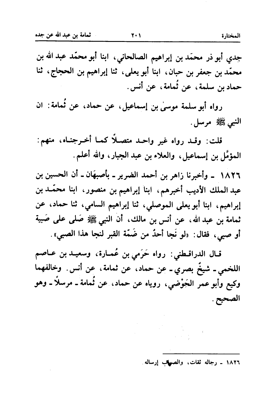 1826 - وَأَخْبَرَنَا زَاهِرُ بْنُ أَحْمَدَ الضَّرِيرُ بِأَصْبَهَانَ أَنَّ الْحُسَيْنَ بْنَ عَبْدِ الْمَلِكِ الأَدِيبَ أَخْبَرَهُمْ أبنا إِبْرَاهِيمُ بْنُ مَنْصُورٍ أبنا مُحَمَّدُ بْنُ إِبْرَاهِيمَ أبنا أَبُو يَعْلَى الْمَوْصِلِيُّ ثَنَا إِبْرَاهِيمُ السَّامِيُّ ثَنَا حَمَّادٌ عَنْ ثُمَامَةَ بْنِ عَبْدِ اللَّهِ عَنْ أَنَسِ بْنِ مَالِكٍ أَنَّ النَّبِيَّ صَلَّى اللَّهُ عَلَيْهِ وَسَلَّمَ صَلَّى عَلَى صَبِيَّةٍ أَوْ صَبِيٍّ فَقَالَ لَوْ نَجَا أَحَدٌ مِنْ ضَمَّةِ الْقَبْرِ لَنَجَا هَذَا الصَّبِيُّ قَالَ الدَّارَقُطْنِيُّ رَوَاهُ حَرَمِيُّ بْنُ عُمَارَةَ وَسَعِيدُ بْنُ عَاصِمٍ اللَّخْمِيُّ شَيْخٌ بَصْرِيٌّ عَنْ حَمَّادٍ عَنْ ثُمَامَةَ عَنْ أَنَسٍ وَخَالَفَهُمَا وَكِيعٌ وَأَبُو عُمَرَ الْحَوْضِيُّ رَوَيَاهُ عَنْ حَمَّادٍ عَنْ ثُمَامَةَ مُرْسَلا وَهُوَ الصَّحِيح