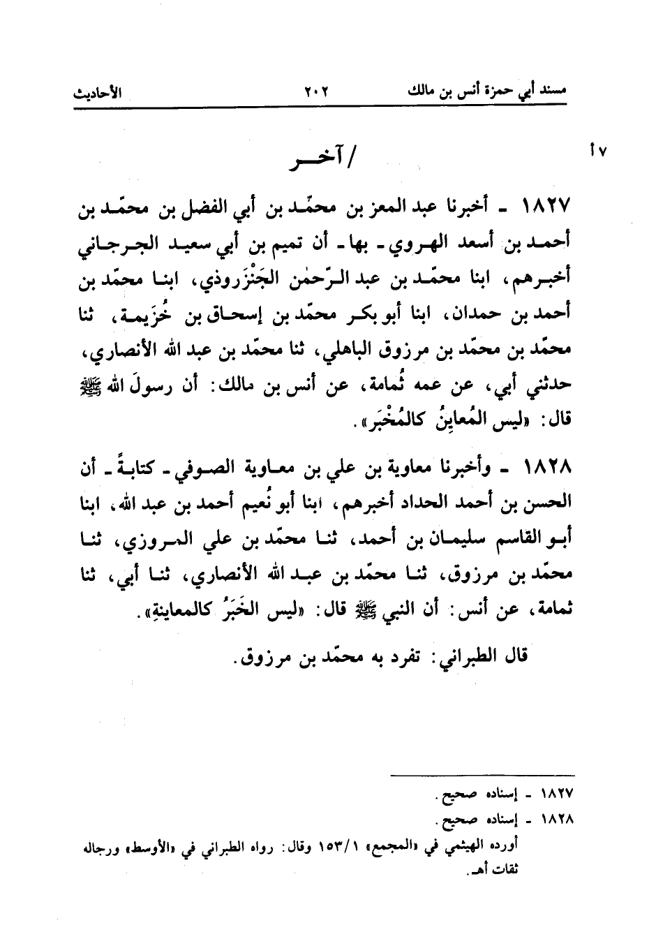 1827 - أَخْبَرَنَا عَبْدُ الْمُعِزِّ بْنُ مُحَمَّدِ بْنِ أَبِي الْفَضْلِ بْنِ مُحَمَّدِ بْنِ أَحْمَدَ بْنِ أَسْعَدَ الْهَرَوِيّ بهَا أَن تيميم بن أبي سعيد الْجِرْجَانِيّ أَخْبَرَهُمْ أبنا مُحَمَّدُ بْنُ عَبْدِ الرَّحْمَنِ الْجَنْزَرُوذِيُّ أبنا مُحَمَّدُ بْنُ أَحْمَدَ بْنِ حَمْدَانَ أبنا أَبُو بَكْرٍ مُحَمَّدُ بْنُ إِسْحَاقَ بْنِ خُزَيْمَةَ ثَنَا مُحَمَّدُ بْنُ مُحَمَّدِ بْنِ مَرْزُوقٍ الْبَاهِلِيُّ ثَنَا مُحَمَّدُ بْنُ عَبْدِ اللَّهِ الأَنْصَارِيُّ حَدَّثَنِي أَبِي عَنْ عَمِّهِ ثُمَامَةَ عَنْ أَنَسِ بْنِ مَالِكٍ أَنَّ رَسُولَ اللَّهِ صَلَّى اللَّهُ عَلَيْهِ وَسلم قَالَ لَيْسَ المعاين كالمخبر إِسْنَاده صَحِيح