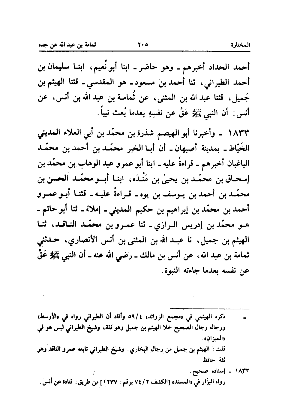 1833 - وَأَخْبَرَنَا أَبُو الْهَيْصَمِ شَذْرَةُ بْنُ مُحَمَّدِ بْنِ أَبِي الْعَلاءِ الْمَدِينِيُّ الْخَيَّاطُ بِمَدِينَةِ أَصْبَهَانَ أَنَّ أَبَا الْخَيْرِ مُحَمَّدَ بْنَ أَحْمَدَ بْنِ مُحَمَّدٍ الباغبان أخْبرهُم قِرَاءَة عَلَيْهِ أبنا أَبُو عَمْرٍو عَبْدُ الْوَهَّابِ بْنُ مُحَمَّدِ بْنِ إِسْحَاقَ بْنِ مُحَمَّدِ بْنِ يَحْيَى بْنِ مَنْدَهْ أنبا أَبُو مُحَمَّدٍ الْحَسَنُ بْنُ مُحَمَّدِ بْنِ أَحْمَدَ بْنِ يُوسُفَ بْنِ يُوهْ قِرَاءَةً عَلَيْهِ قثنا أَبُو عَمْرٍو أَحْمَدُ بْنُ مُحَمَّدِ بْنِ إِبْرَاهِيمَ بْنِ حَكِيمٍ الْمَدِينِيُّ إِمْلاءً ثَنَا أَبُو حَاتِمٍ هُوَ مُحَمَّدُ بْنُ إِدْرِيسَ الرَّازِيُّ ثَنَا عَمْرُو بْنُ مُحَمَّدٍ النَّاقِدُ ثَنَا الْهَيْثَمُ بْنُ جَمِيلٍ نَا عَبْدُ اللَّهِ بْنُ الْمُثَنَّى بْنِ أَنَسٍ الأَنْصَارِيُّ حَدَّثَنِي ثُمَامَةُ بْنُ عَبْدِ اللَّهِ عَنْ أَنَسِ بْنِ مَالِكٍ رَضِيَ اللَّهُ عَنْهُ أَنَّ النَّبِيَّ صَلَّى اللَّه عَلَيْهِ وَسَلَّمَ عَقَّ عَنْ نَفْسِهِ بَعْدَمَا جَاءَتْهُ النُّبُوَّةُ