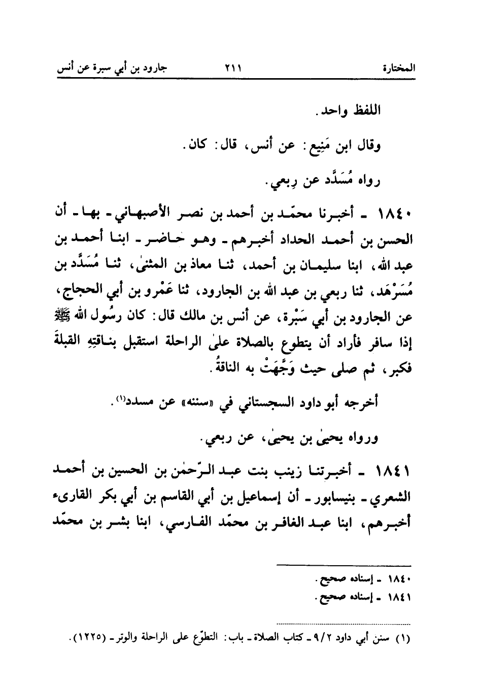 1840 - أَخْبَرَنَا مُحَمَّدُ بْنُ أَحْمَدَ بْنِ نَصْرٍ الأَصْبَهَانِيُّ بِهَا أَنَّ الْحَسَنَ بْنَ أَحْمَدَ الْحَدَّادَ أخبرهُمْ وَهُوَ حَاضِرٌ أبنا أَحْمَدُ بْنُ عَبْدِ اللَّهِ أبنا سُلَيْمَانُ بْنُ أَحْمَدَ ثَنَا مُعَاذُ بْنُ الْمُثَنَّى ثَنَا مُسَدَّدُ بْنُ مُسَرْهَدٍ ثَنَا رِبْعِيُّ بْنُ عَبْدِ اللَّهِ بْنِ الْجَارُودِ ثَنَا عَمْرُو بْنُ أَبِي الْحَجَّاجِ عَنِ الْجَارُودِ بْنِ أَبِي سَبْرَةَ عَنْ أَنَسِ بْنِ مَالِكٍ قَالَ كَانَ رَسُولِ اللَّهِ صَلَّى اللَّهُ عَلَيْهِ وَسَلَّمَ إِذَا سَافَرَ فَأَرَادَ أَنْ يَتَطَوَّعَ بِالصَّلاةِ عَلَى الرَّاحِلَةِ اسْتَقْبَلَ بِنَاقَتِهِ الْقِبْلَةَ فَكَبَّرَ ثُمَّ صَلَّى حَيْثُ وَجَّهَتْ بِهِ النَّاقَةُ أَخْرَجَهُ أَبُو دَاوُدَ السِّجِسْتَانِيُّ فِي سُنَنِهِ عَنْ مُسَدَّدٍ وَرَوَاهُ يَحْيَى بْنُ يحيى عَن ربعي إِسْنَاده صَحِيح