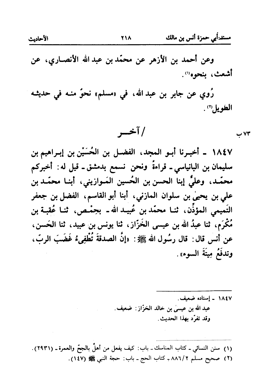 1847 - أَخْبَرَنَا أَبُو الْمَجْدِ الْفَضْلُ بْنُ الْحُسَيْنِ بْنِ إِبْرَاهِيمَ بْنِ سُلَيْمَانَ بْنُ الْبَانِيَاسِيِّ قِرَاءَةً وَنَحْنُ نَسْمَعُ بِدِمَشْقَ قِيلَ لَهُ أَخْبَرَكُمْ مُحَمَّدٌ وَعَلِيٌّ إبنا الْحسن بن الْحُسَيْن الموازيني أبنا مُحَمَّدُ بْنُ عَلِيِّ بْنِ يَحْيَى بْنِ سُلْوَانَ الْمَازِني أبنا أبوالقاسم الْفَضْلُ بْنُ جَعْفَرٍ التَّمِيمِيُّ الْمُؤَذِّنُ ثَنَا مُحَمَّدُ بْنُ عُبَيْدِ اللَّهِ بِحِمْصَ ثَنَا عُقْبَةُ بْنُ مُكْرَمٍ ثَنَا عَبْدُ اللَّهِ بْنُ عِيسَى الْخَزَّازُ ثَنَا يُونُسُ بْنُ عُبَيْدٍ ثَنَا الْحَسَنُ عَنْ أَنَسٍ قَالَ قَالَ رَسُولُ اللَّهِ صَلَّى اللَّهُ عَلَيْهِ وَسَلَّمَ إِنَّ الصَّدَقَةَ تُطْفِئُ غَضَبَ الرَّبِّ وَتَدْفَعُ مِيتَةَ السُّوءِ