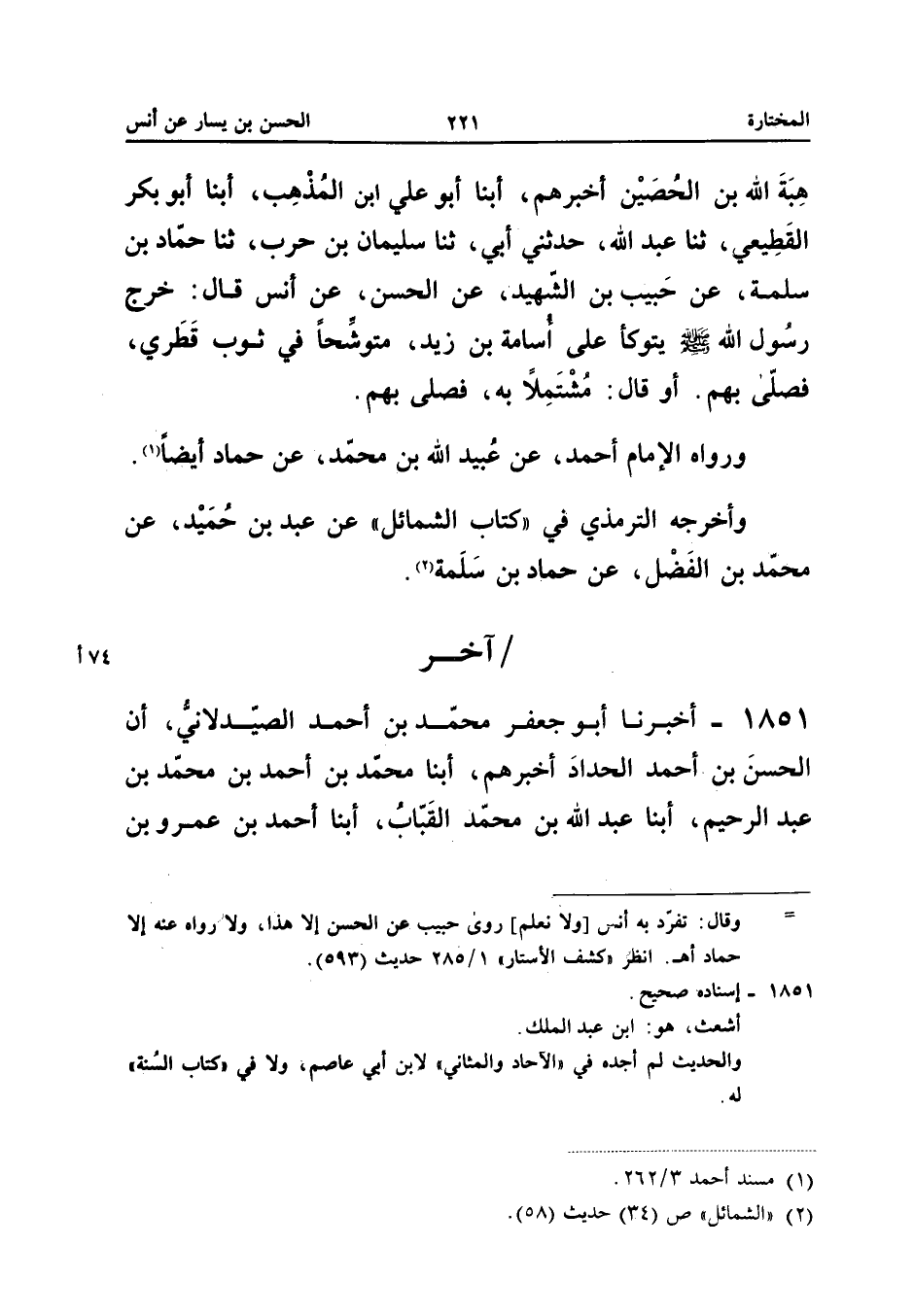 يَتَوَكَّأُ عَلَى أُسَامَةَ بْنِ زَيْدٍ مُتَوَشِّحًا فِي ثَوْبٍ قِطْرِيٍّ فَصَلَّى بِهِمْ أَوْ قَالَ مُشْتَمِلا بِهِ فَصَلَّى بِهِمْ وَرَوَاهُ الإِمَامُ أَحْمَدُ عَنْ عُبَيْدِ اللَّهِ بْنِ مُحَمَّدٍ عَنْ حَمَّادٍ أَيْضًا وَأَخْرَجَهُ التِّرْمِذِيُّ فِي كِتَابِ الشَّمَائِلِ عَنْ عَبْدِ بْنِ حُمَيْدٍ عَنْ مُحَمَّدِ بْنِ الْفَضْلِ عَنْ حَمَّاد بن سَلمَة