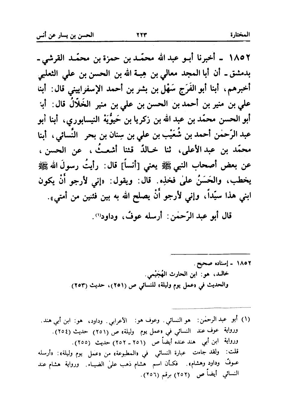 1852 - أَخْبَرَنَا أَبُو عَبْدِ اللَّهِ مُحَمَّدُ بْنُ حَمْزَةَ بْنِ مُحَمَّدٍ الْقُرَشِيُّ بِدِمَشْقَ أَنَّ أَبَا الْمَجْدِ مَعَالِيَ بْنَ هِبَةِ اللَّهِ بْنِ الْحَسَنِ بْنِ عَليّ الثَّعْلَبِيّ أَخْبَرَهُمْ أبنا أَبُو الْفَرَجِ سَهْلُ بْنُ بِشْرِ بن أَحْمد الإِسْفِرَايِينِيّ قَالَ أبنا عَلِيُّ بْنُ مُنِيرِ بْنِ أَحْمَدَ بْنِ الْحَسَنِ بْنِ عَلِيِّ بْنِ مُنِيرٍ الْخَلالُ قَالَ أبنا أَبُو الْحَسَنِ مُحَمَّدُ بْنُ عَبْدِ اللَّهِ بْنِ زَكَرِيَّا بْنِ حَيُّوَيْهِ النَّيْسَابُورِيُّ أبنا أَبُو عَبْدِ الرَّحْمَنِ أَحْمَدُ بْنُ شُعَيْبِ بْنِ عَلِيٍّ بن سِنَان بن بَحر النَّسَائِيّ أبنا مُحَمَّدُ بْنُ عَبْدِ الأَعْلَى ثَنَا خَالِدٌ قثنا أَشْعَثُ عَنِ الْحَسَنِ عَنْ بَعْضِ أَصْحَابِ النَّبِيِّ صَلَّى اللَّهُ عَلَيْهِ وَسَلَّمَ يَعْنِي [أَنَسًا] قَالَ رَأَيْتُ رَسُولَ اللَّهِ صَلَّى اللَّهُ عَلَيْهِ وَسَلَّمَ يَخْطُبُ وَالْحَسَنُ عَلَى فَخِذِهِ قَالَ وَيَقُولُ إِنِّي لأَرْجُو أَنْ يَكُونَ ابْنِي هَذَا سَيِّدًا وَإِنِّي لأَرْجُو أَنْ يُصْلِحَ اللَّهُ بِهِ بَيْنَ فِئَتَيْنِ مِنْ أُمَّتِي قَالَ أَبُو عَبْدِ الرَّحْمَنِ أَرْسَلَهُ عَوْف وَدَاوُد