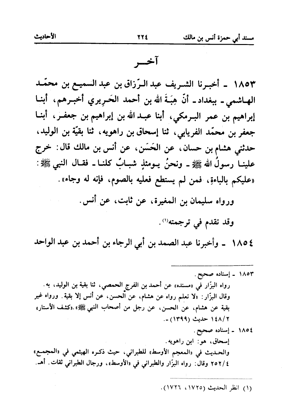 1853 - أَخْبَرَنَا الشَّرِيفُ عَبْدُ الرَّزَّاقِ بْنُ عَبْدِ السَّمِيعِ بْنِ مُحَمَّدٍ الْهَاشِمِيُّ بِبَغْدَادَ أَنَّ هِبَةَ اللَّهِ بن أَحْمد الْحَرِيرِيَّ أَخْبَرَهُمْ أبنا إِبْرَاهِيمُ بْنُ عُمَرَ الْبَرْمَكِيُّ أبنا عَبْدُ اللَّهِ بْنُ إِبْرَاهِيمَ بْنِ جَعْفَرِ أبنا جَعْفَرُ بْنُ مُحَمَّدٍ الْفِرْيَابِيُّ ثَنَا إِسْحَاقُ بْنُ رَاهَوَيْهِ ثَنَا بَقِيَّةُ بْنُ الْوَلِيدِ حَدَّثَنِي هِشَامُ بْنُ حَسَّانٍ عَنِ الْحَسَنِ عَنْ أَنَسِ بْنِ مَالِكٍ قَالَ خَرَجَ عَلَيْنَا رَسُولُ اللَّهِ صَلَّى اللَّهُ عَلَيْهِ وَسَلَّمَ وَنَحْنُ يَوْمَئِذٍ شَبَابٌ كُلُّنَا فَقَالَ النَّبِيُّ صَلَّى اللَّهُ عَلَيْهِ وَسَلَّمَ عَلَيْكُمْ بِالْبَاءَةِ فَمن لم يتسطع فَعَلَيْهِ بِالصَّوْمِ فَإِنَّهُ لَهُ وِجَاءٌ وَرَوَاهُ سُلَيْمَانُ بْنُ الْمُغِيرَةِ عَنْ ثَابِتٍ عَنْ أَنَسٍ وَقَدْ تقدم فِي تَرْجَمته إِسْنَاده صَحِيح