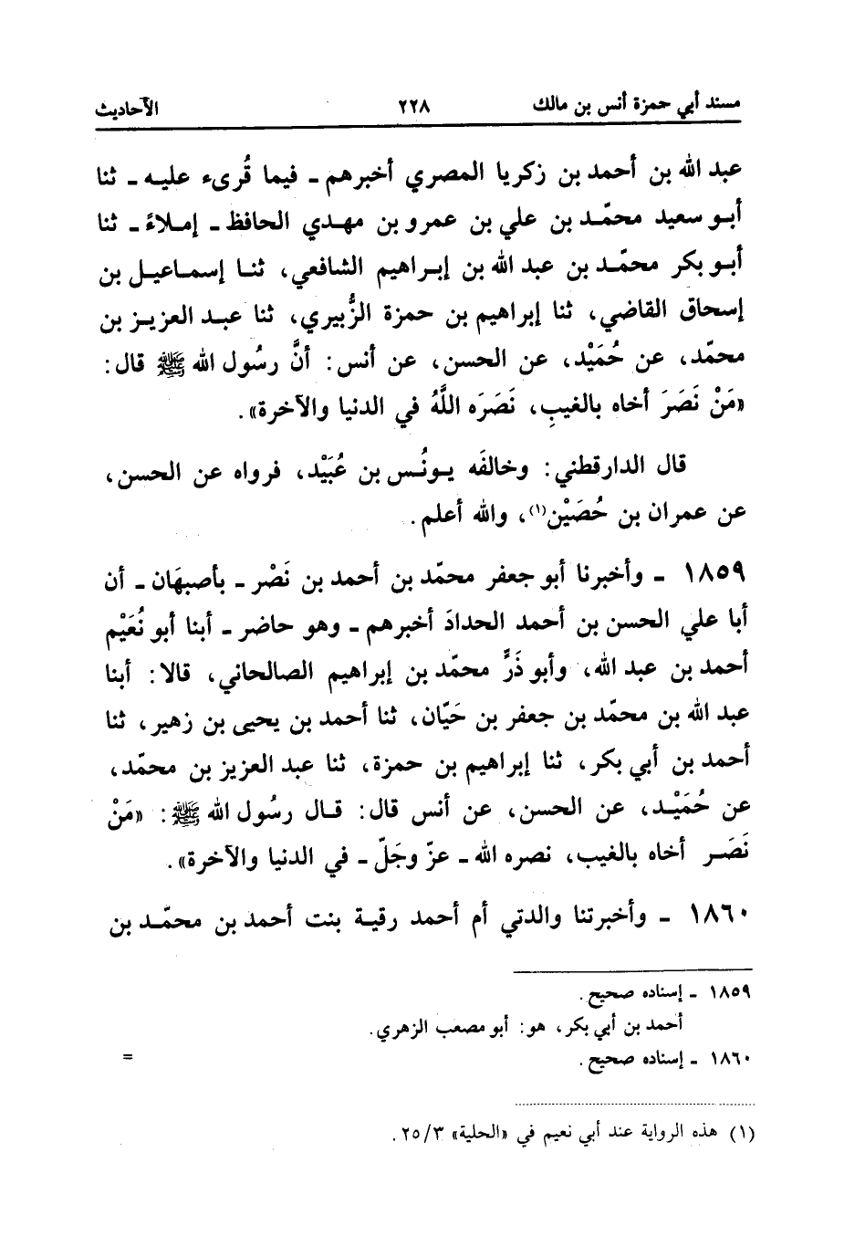 1859 - وَأَخْبَرَنَا أَبُو جَعْفَرٍ مُحَمَّدُ بْنُ أَحْمَدَ بْنِ نَصْرٍ بِأَصْبَهَانَ أَنَّ أَبَا عَلِيٍّ الْحَسَنَ بْنَ أَحْمَدَ الْحَدَّادَ أَخْبَرَهُمْ وَهُوَ حَاضِرٌ أبنا أَبُو نُعَيْمٍ أَحْمَدُ بْنُ عَبْدِ اللَّهِ وَأَبُو ذَر مُحَمَّد بن إِبْرَاهِيم الصالحاني قَالا أبنا عَبْدُ اللَّهِ بْنُ مُحَمَّدِ بْنِ جَعْفَرِ بْنِ حَيَّانَ ثَنَا أَحْمَدُ بْنُ يَحْيَى بْنِ زُهَيْرٍ ثَنَا أَحْمَدُ بْنُ أَبِي بَكْرٍ ثَنَا إِبْرَاهِيمُ بْنُ حَمْزَةَ ثَنَا عَبْدُ الْعَزِيزِ بْنُ مُحَمَّدٍ عَنْ حُمَيْدٍ عَنِ الْحَسَنِ عَنْ أَنَسٍ قَالَ قَالَ رَسُولُ اللَّهِ صَلَّى اللَّهُ عَلَيْهِ وَسَلَّمَ مَنْ نَصَرَ أَخَاهُ بِالْغَيْبِ نَصَرَهُ الله عز وَجل فِي الدُّنْيَا والاخرة إِسْنَاده صَحِيح
