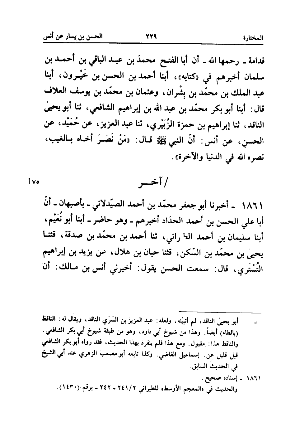 1861 - أَخْبَرَنَا أَبُو جَعْفَرٍ مُحَمَّدُ بْنُ أَحْمَدَ الصَّيْدَلانِيُّ بِأَصْبَهَانَ أَنَّ أَبَا عَلِيٍّ الْحَسَنَ بْنَ أَحْمَدَ الْحَدَّادَ أَخْبَرَهُمْ وَهُوَ حَاضِرٌ أبنا أَبُو نُعَيْمٍ أبنا سُلَيْمَانُ بْنُ أَحْمَدَ الطَّبَرَانِيُّ ثَنَا أَحْمَدُ بْنُ مُحَمَّدِ بْنِ صَدَقَةَ قثنا يَحْيَى بْنُ مُحَمَّدِ بْنِ السَّكَنِ قثنا حِبَّانُ بْنُ هِلالٍ عَنْ يَزِيدَ بْنِ إِبْرَاهِيمَ التُّسْتَرِيِّ قَالَ سَمِعْتُ الْحَسَنَ يَقُولُ أَخْبَرَنِي أَنَسُ بْنُ مَالِكٍ أَنَّ رَسُول الله ص