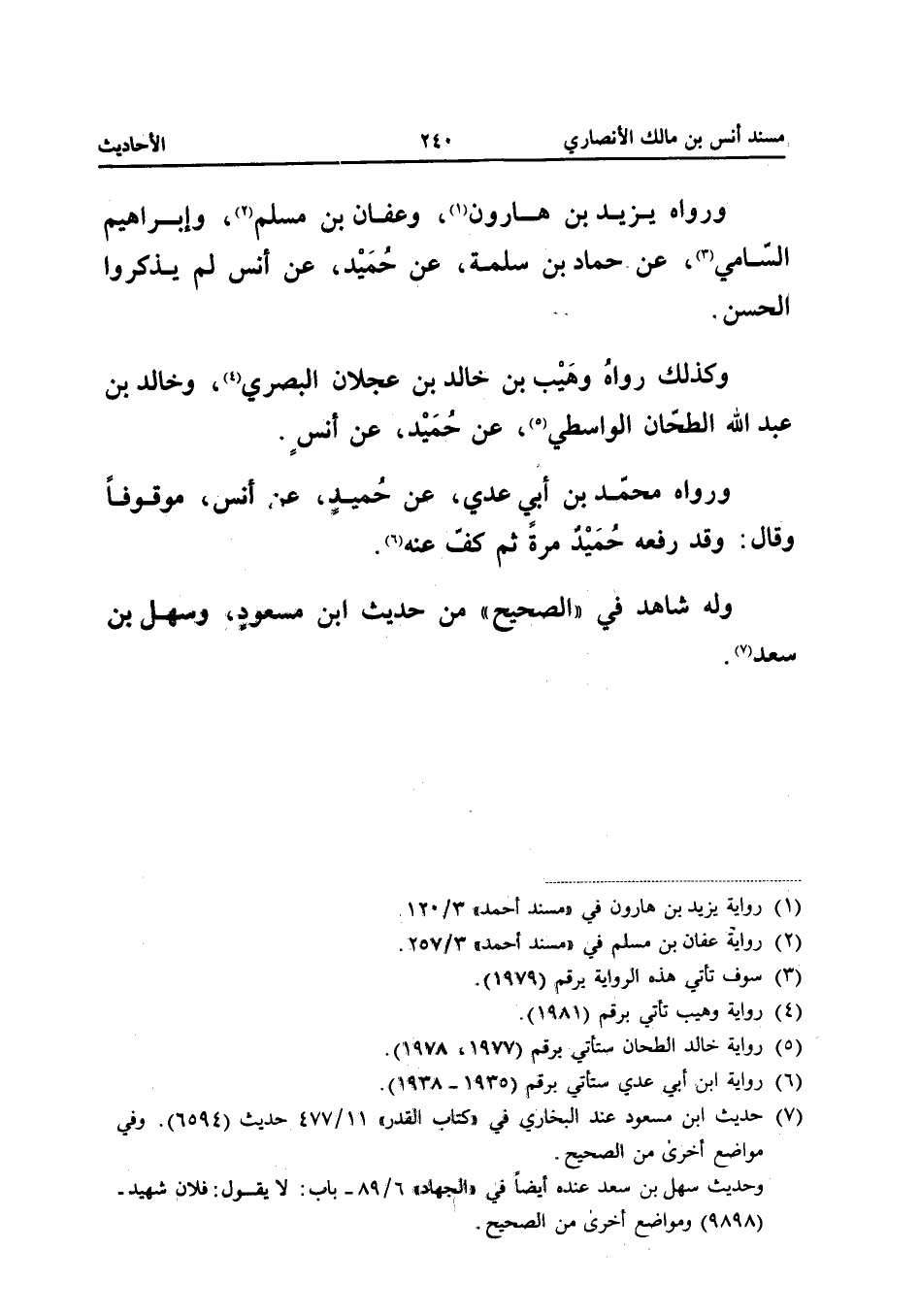 وَرَوَاهُ يَزِيدُ بْنُ هَارُونَ وَعَفَّانُ بْنُ مُسْلِمٍ وَإِبْرَاهِيمُ السَّامِيُّ عَنْ حَمَّادِ بْنِ سَلَمَةَ عَنْ حُمَيْدٍ عَنْ أَنَسٍ لَمْ يَذْكُرُوا الْحَسَنَ وَكَذَلِكَ رَوَاهُ وُهَيْبُ بْنُ خَالِدِ بْنِ عَجْلانَ الْبَصْرِيُّ وَخَالِدُ بْنُ عَبْدِ اللَّهِ الطَّحَّانُ الْوَاسِطِيُّ عَنْ حُمَيْدٍ عَنْ أَنَسٍ وَرَوَاهُ مُحَمَّدُ بْنُ أَبِي عَدِيٍّ عَنْ حُمَيْدٍ عَنْ أَنَسٍ مَوْقُوفًا وَقَالَ وَقَدْ رَفَعَهُ حُمَيْدٌ مَرَّةً ثُمَّ كَفَّ عَنْهُ وَلَهُ شَاهِدٌ فِي الصَّحِيحِ مِنْ حَدِيثِ ابْنِ مَسْعُود وَسَهل بن سعد