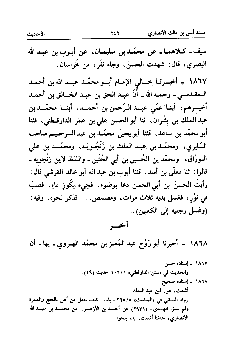 1867 - أَخْبَرَنَا خَالِي الإِمَامُ أَبُو مُحَمَّدٍ عَبْدُ اللَّهِ بْنُ أَحْمَدَ الْمَقْدِسِيُّ رَحِمَهُ اللَّهُ أَنَّ عَبْدَ الْحَقِّ بْنَ عَبْدِ الْخَالِقِ بْنِ أَحْمَدَ أَخْبَرَهُمْ أبنا عَمِّي عَبْدُ الرَّحْمَنِ بْنُ أَحْمَدَ أبنا مُحَمَّدُ بْنُ عَبْدِ الْمَلِكِ بْنِ بِشْرَانَ ثَنَا أَبُو الْحَسَنِ عَلِيُّ بْنُ عُمَرَ الدَّارَقُطْنِيُّ قثنا أَبُو مُحَمَّدِ بْنُ سَاعِدٍ قثنا أَبُو يَحْيَى مُحَمَّدُ بْنُ عَبْدِ الرَّحِيمِ صَاحِبُ السَّابرِيِّ وَمُحَمَّدُ بْنُ عَبْدِ الْمَلِكِ بْنِ زَنْجُوَيْهِ وَمُحَمَّدُ بْنُ عَلِيٍّ الْوَرَّاقُ وَمُحَمَّدُ بْنُ الْحُسَيْنِ بْنِ أَبِي الْحَنِينِ وَاللَّفْظُ لابْنِ زَنْجُوَيْهِ قَالُوا ثَنَا مُعَلَّى بْنُ أَسَدٍ قثنا أَيُّوبُ بْنُ عَبْدِ اللَّهِ أَبُو خَالِدٍ الْقُرَشِيُّ قَالَ رَأَيْتُ الْحَسَنَ بْنَ أَبِي الْحَسَنِ دَعَا بِوُضُوءٍ فَجِيءَ بِكُوزِ مَاءٍ فَصَبَّ فِي تَوْرٍ فَغَسَلَ يَدَيْهِ ثَلاثَ مَرَّاتٍ وَمَضْمَضَ فَذَكَرَ نَحْوَهُ وَفِيهِ (وَغَسَلَ رِجْلَيْهِ إِلَى الْكَعْبَيْنِ)